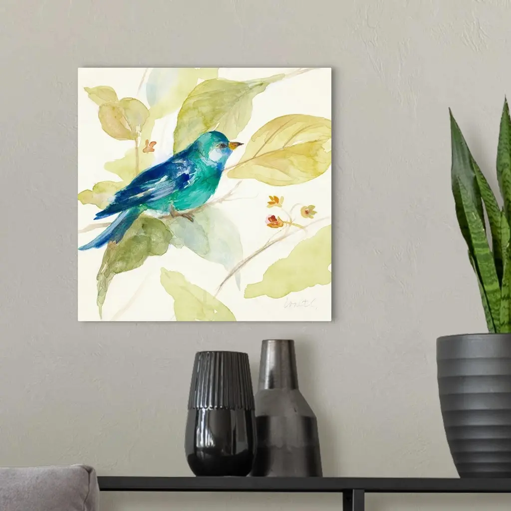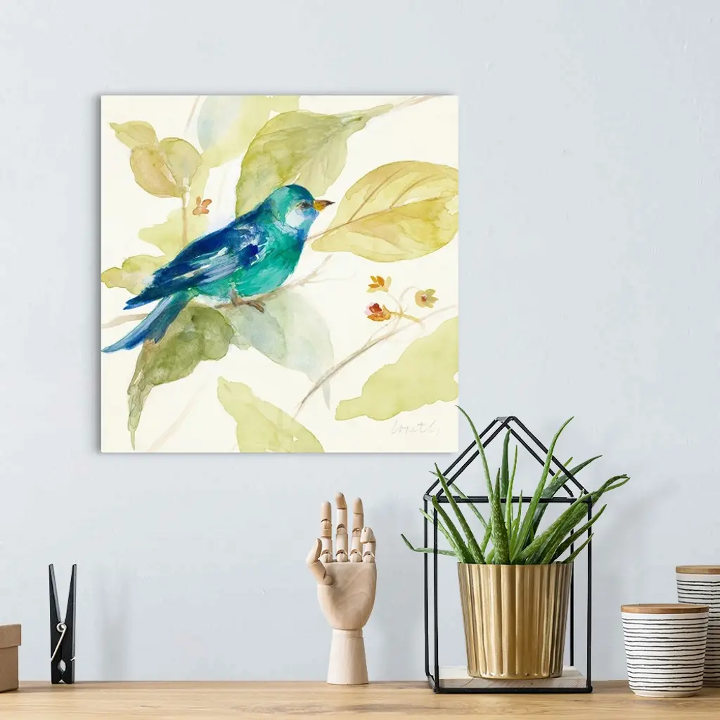 Square watercolor painting of a bird made with different shades of blue perched on a tree branch, surrounded by green, yellow, and blue leaves and flower buds.