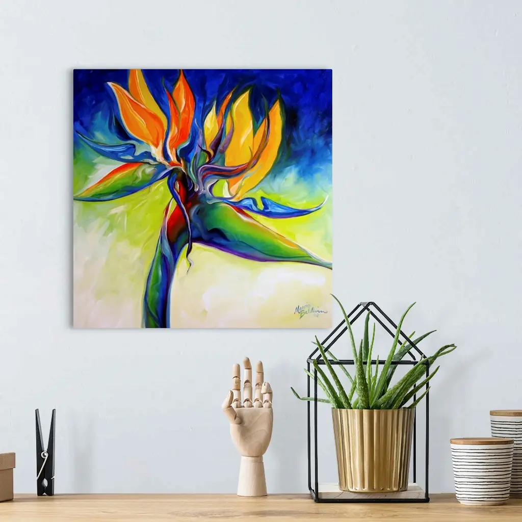 Contemporary painting of a bird of paradise flower on a blue, green, yellow, and cream square background.