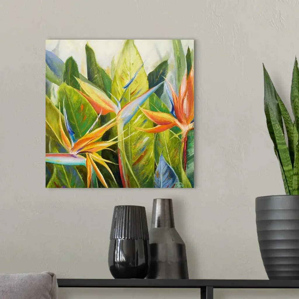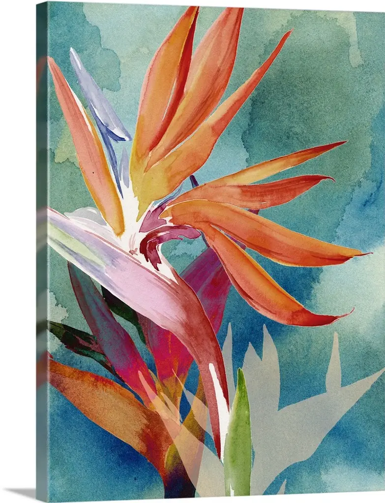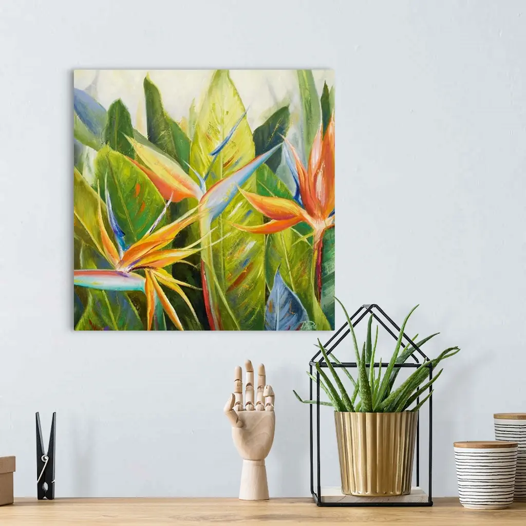 Contemporary artwork of multicolored plants and large green leaves standing straight up in the background.