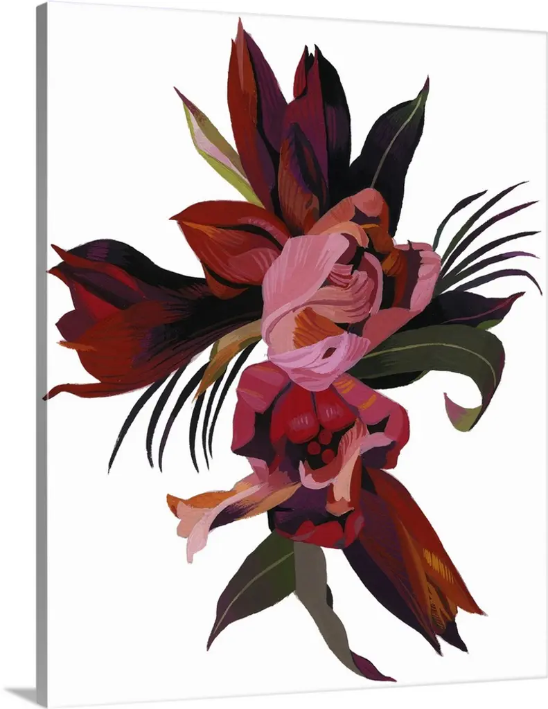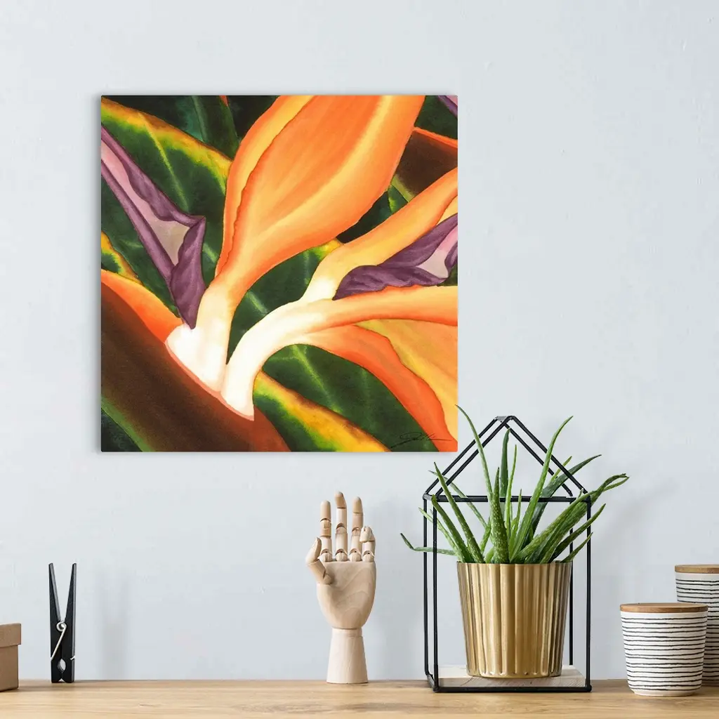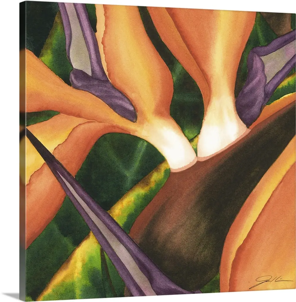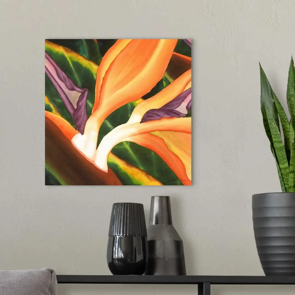 A contemporary painting of a close-up of a group of birds of paradise flowers.