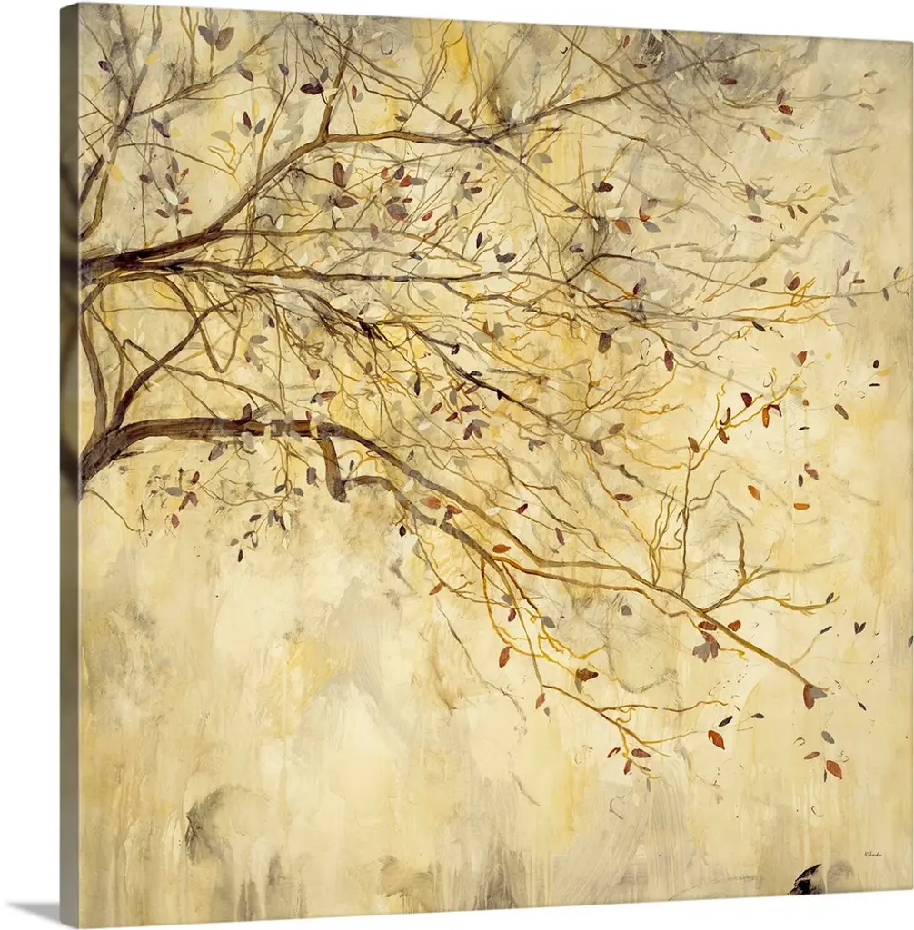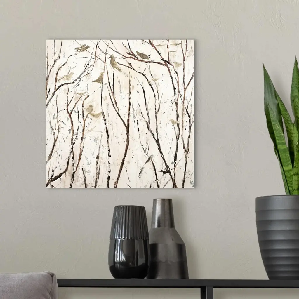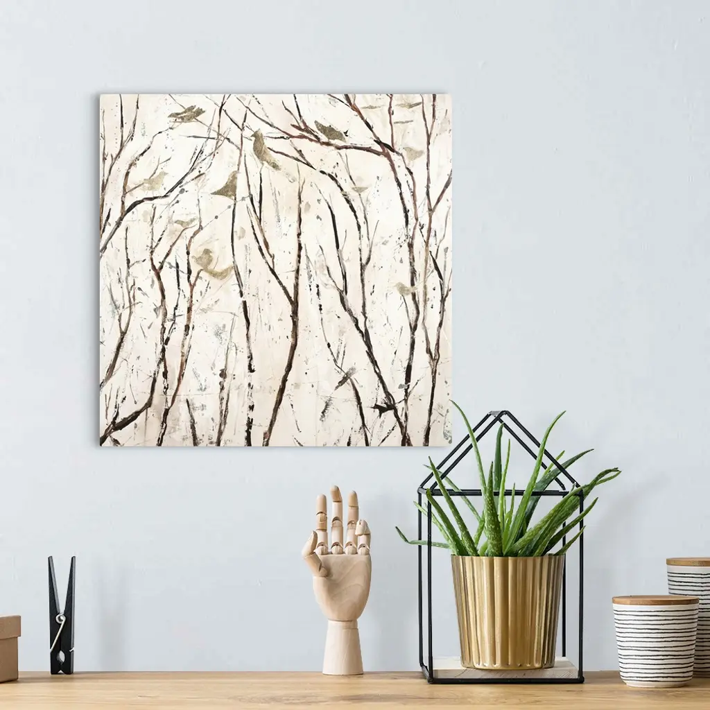 Square painting in neutral white and brown hues with gold birds perched on bare branches.