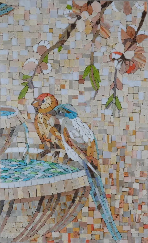 Introducing "Birds by the Fountain - Mosaic Art," a stunning handcrafted piece that captures the serene beauty of nature in a breathtaking mosaic format. This exquisite artwork features two charming birds gracefully perched by a tranquil water fountain, creating a vivid scene that invites peace and tranquility into your home. Crafted with meticulous attention to detail, this premium quality mosaic showcases a soft palette of pastel colors that harmoniously blend to create an ethereal ambiance. Each natural stone tile is carefully selected to enhance the simplistic yet elegant design, making it a perfect addition to any living room, office, or garden space. The mosaic’s use of exotic materials includes the vibrant Blue Macaubas quartzite, which dazzles with its electric blue radiance and stunning cerulean veining, lending the artwork a sapphire-like depth and captivating tropical blue luxury. Complementing this is the luminous Orange Quartz, whose radiant, crystalline shimmer adds a jewel-like, prismatic brilliance that enriches the overall composition with a warm, glowing allure. "Birds by the Fountain - Mosaic Art" is not just decoration; it celebrates nature’s beauty. The gentle curves of the fountain and delicate bird forms evoke a serene calm that transforms any environment into a sanctuary. Hang it on your wall as a captivating focal point or place it on a shelf to add depth and interest to your décor. This mosaic also makes a thoughtful gift for bird lovers, art enthusiasts, or anyone seeking to elevate their space with nature-inspired elegance. Durable and crafted from luxury stone, this piece promises to be a cherished part of your décor for years to come. Bring home this enchanting artwork today and let the radiant charm and silky, cool-to-the-touch mosaic brighten your space with timeless elegance.