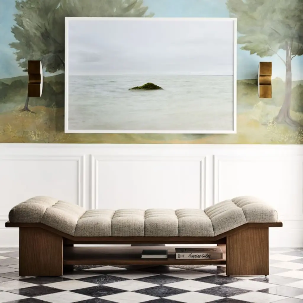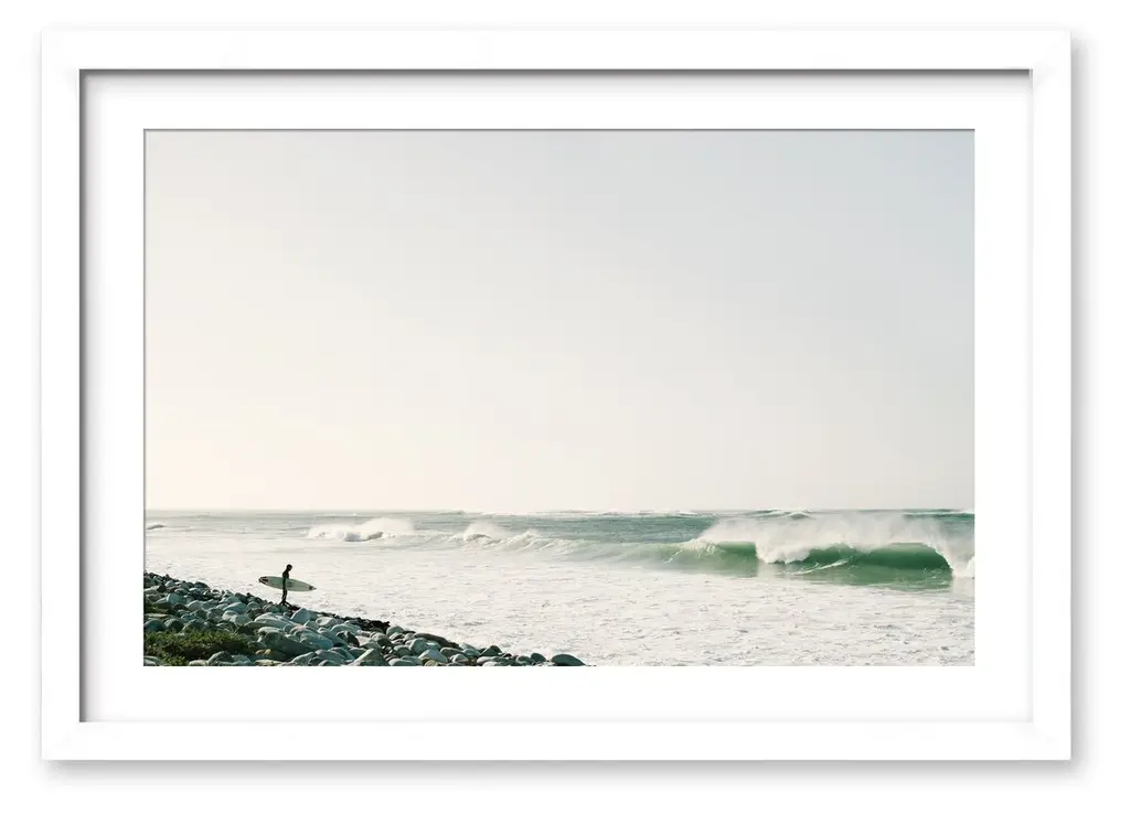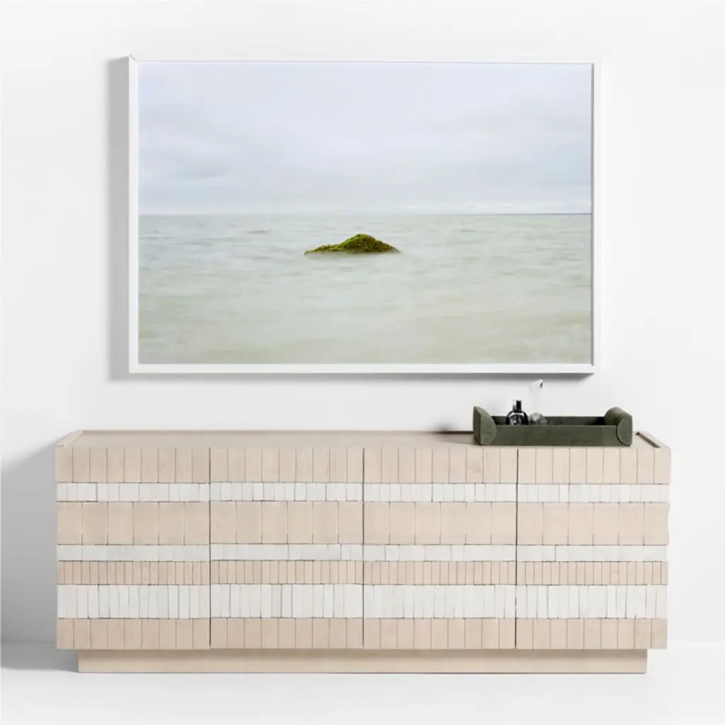Artist EJ Camp never tires of photographing the glacial remnants that dot the Long Island coastline. This view captures the tip of one of these prehistoric deposits in a calm moment when sea and sky seem to meld in soft pastels. Each giclee print of the original image is reproduced on photographic paper and presented under clear acrylic in a matte white-finished wood shadowbox frame.