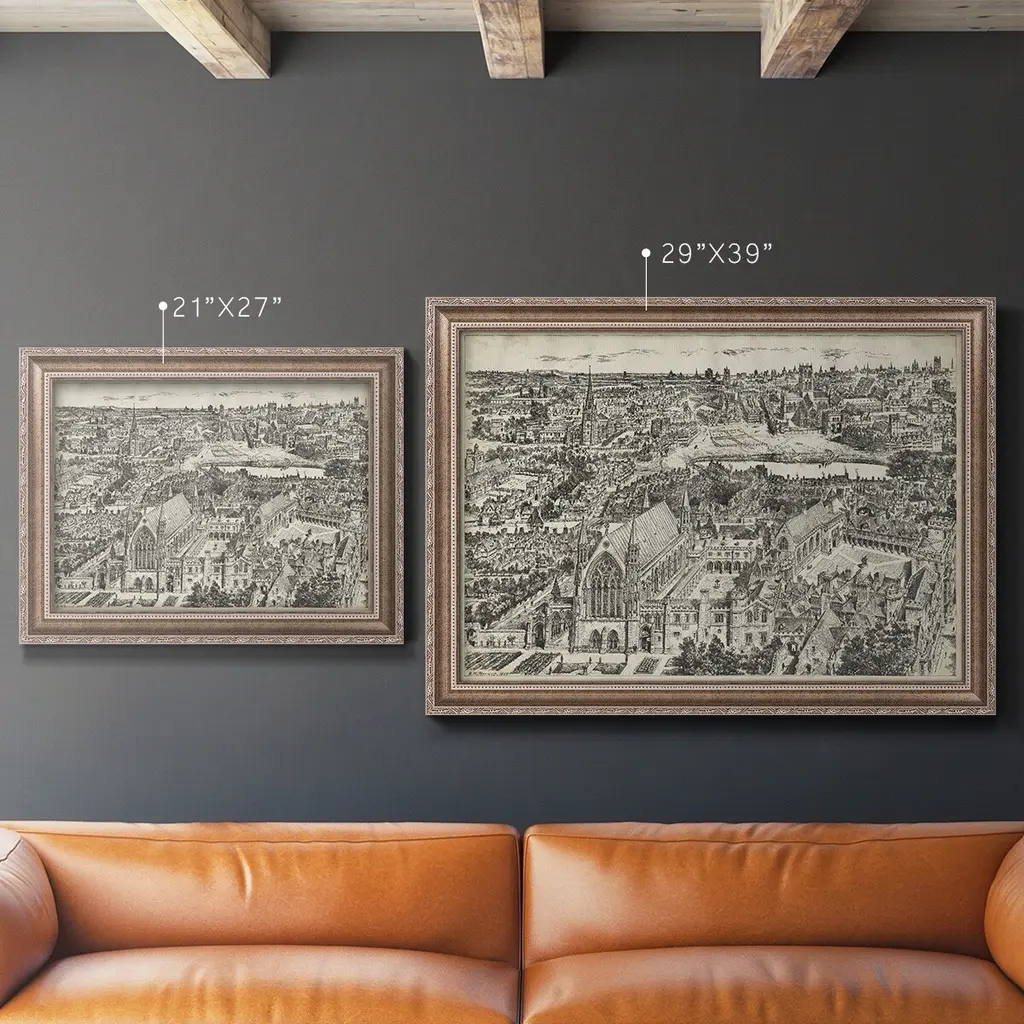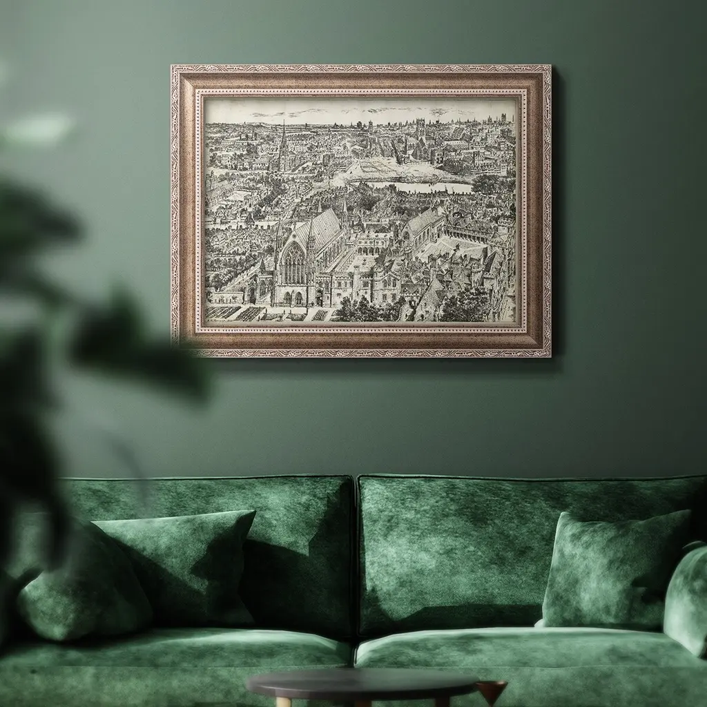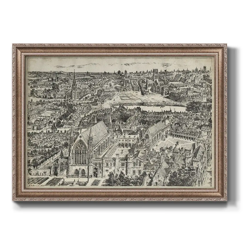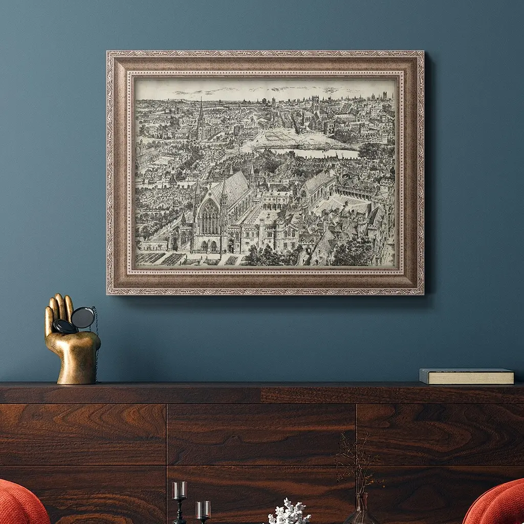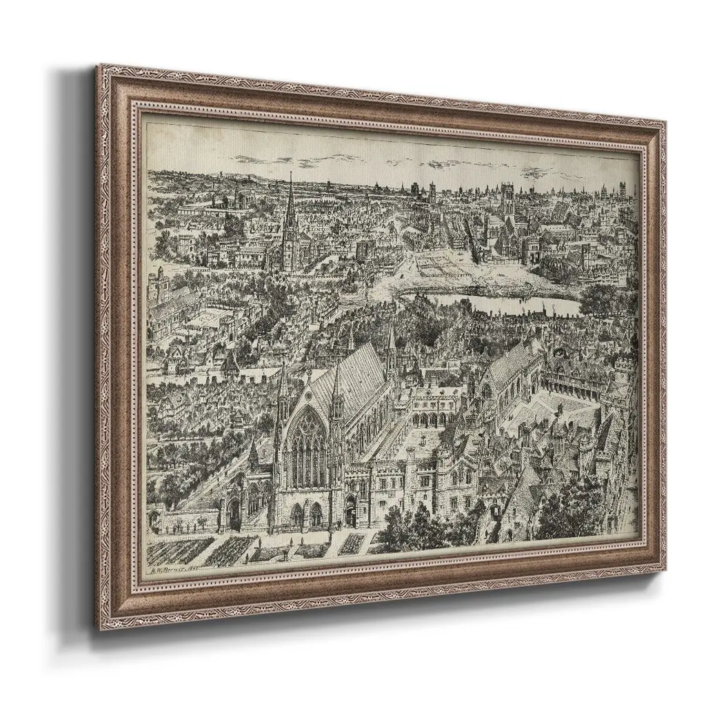 Bird's Eye View of London - Ely Place Premium Framed Canvas- Ready to Hang A Premium Framed Canvas created to last. Framed in distressed wood and available in an array of sizes and colors Featuring a beveled a solid wood stretcher bar, each piece comes ready to hand 3 SIZES AVAILABLE 16''X20'' - Overall Size 18'X27'' - Overall Size 24''x36'' - Overall Size Each piece is made to order. Each piece comes with hanging hardware. Made in the USA Ready to Hang Giclee Paper Print Acrylic Glass Beveled Matt Board