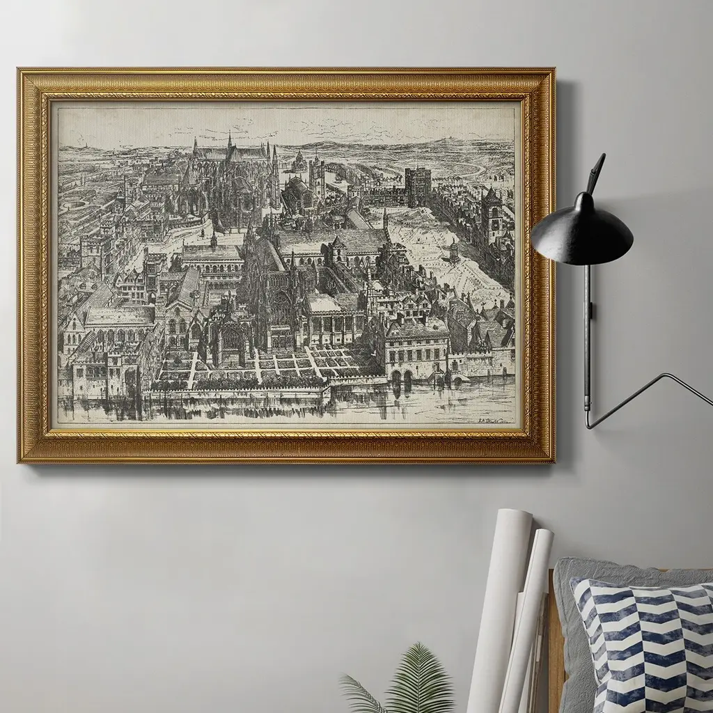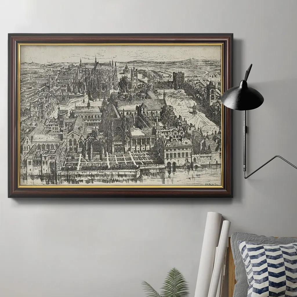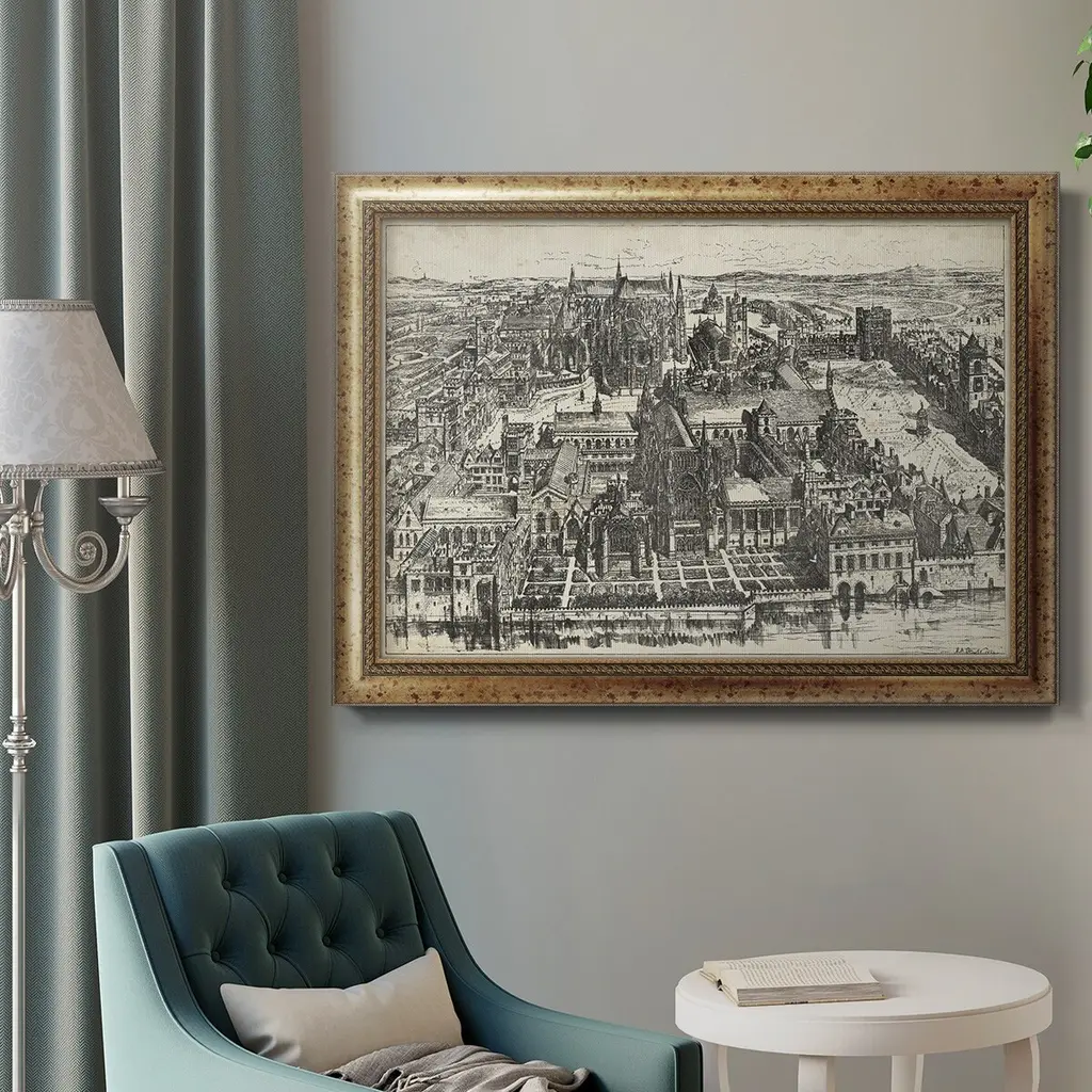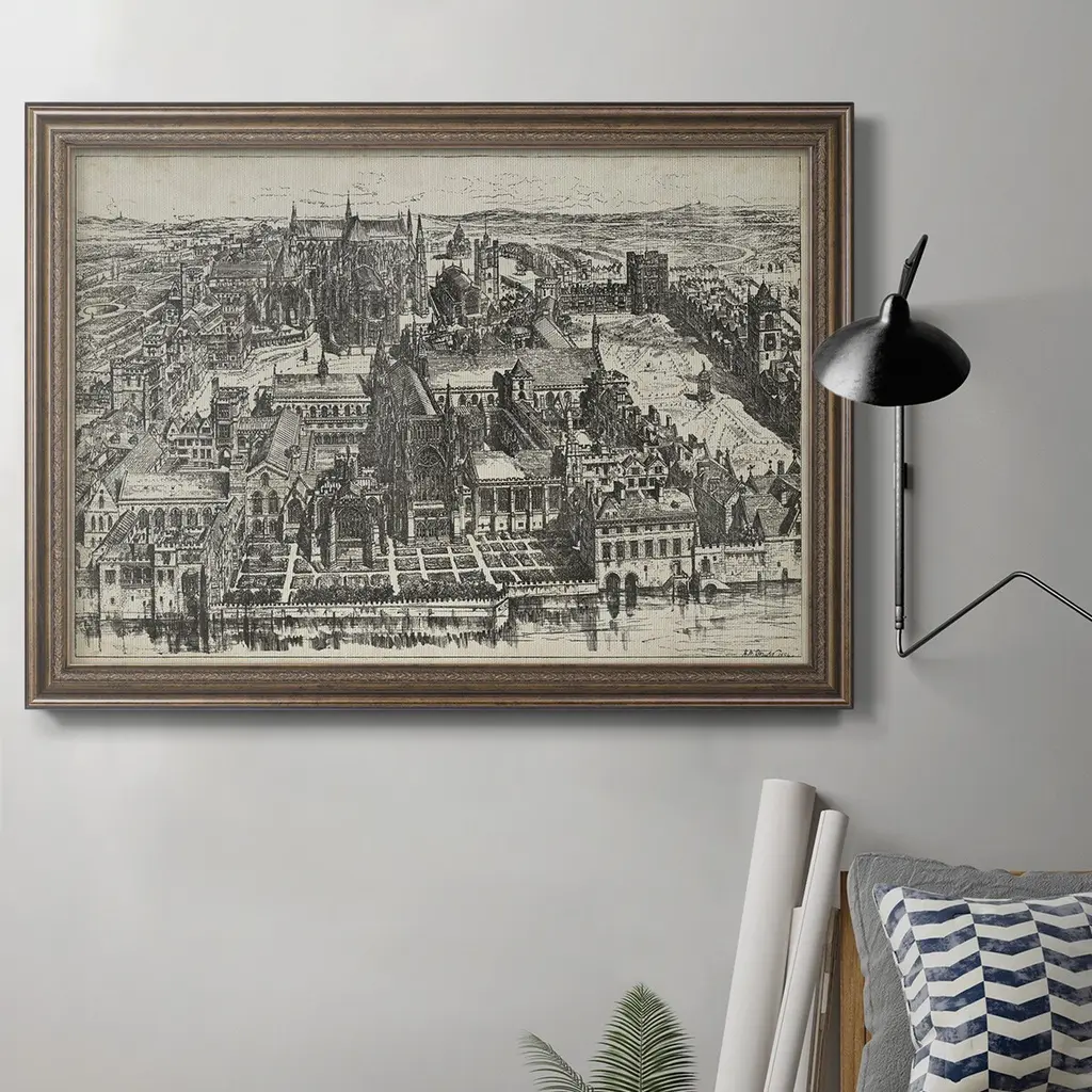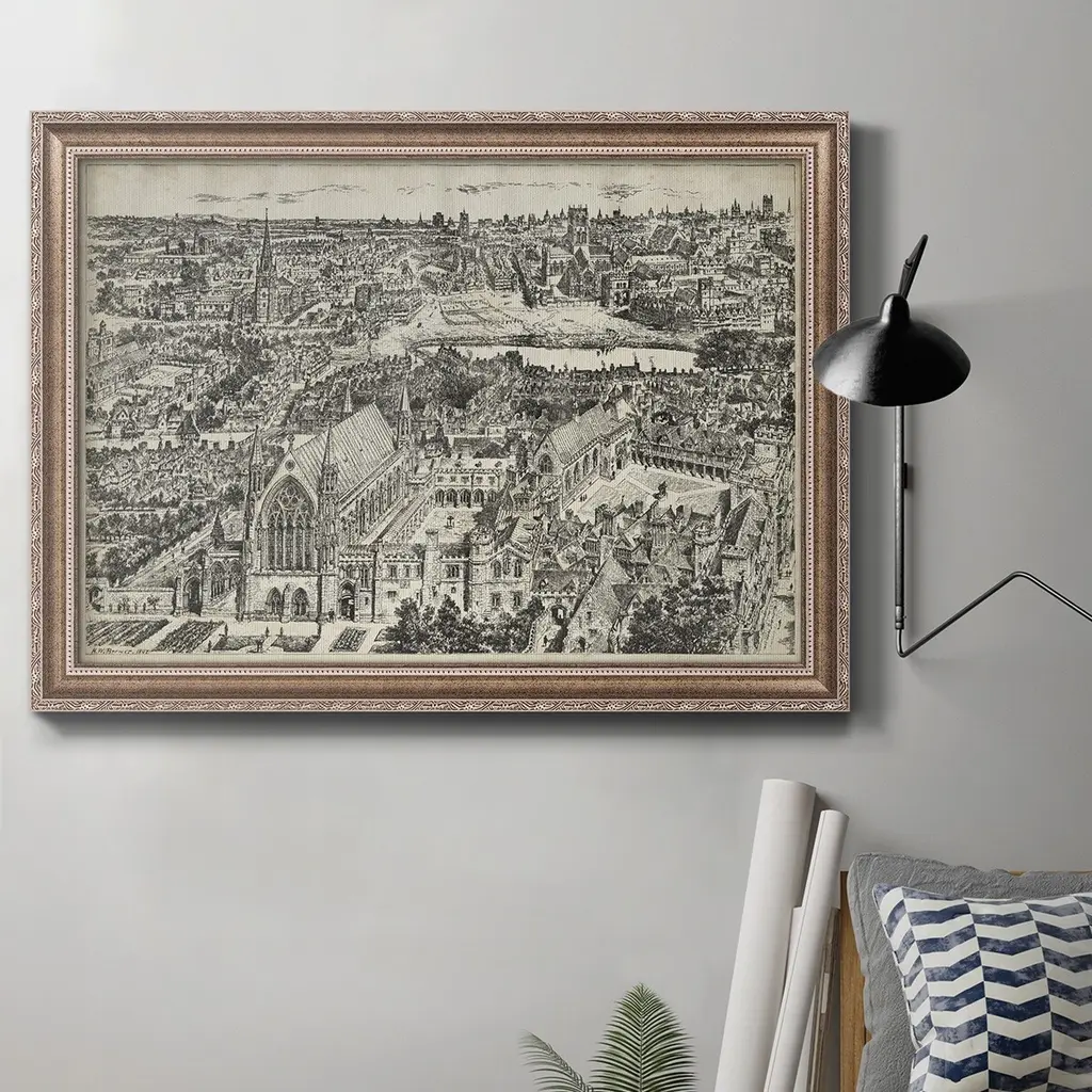 Bird's Eye View of London - Westminster Premium Framed Canvas- Ready to Hang A Premium Framed Canvas created to last. Framed in distressed wood and available in an array of sizes and colors Featuring a beveled a solid wood stretcher bar, each piece comes ready to hand 3 SIZES AVAILABLE 16''X20'' - Overall Size 18'X27'' - Overall Size 24''x36'' - Overall Size Each piece is made to order. Each piece comes with hanging hardware. Made in the USA Ready to Hang Giclee Paper Print Acrylic Glass Beveled Matt Board