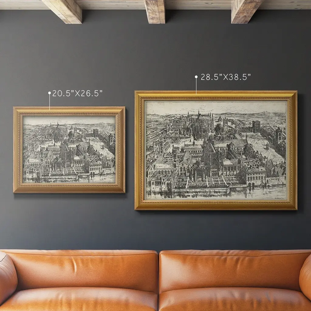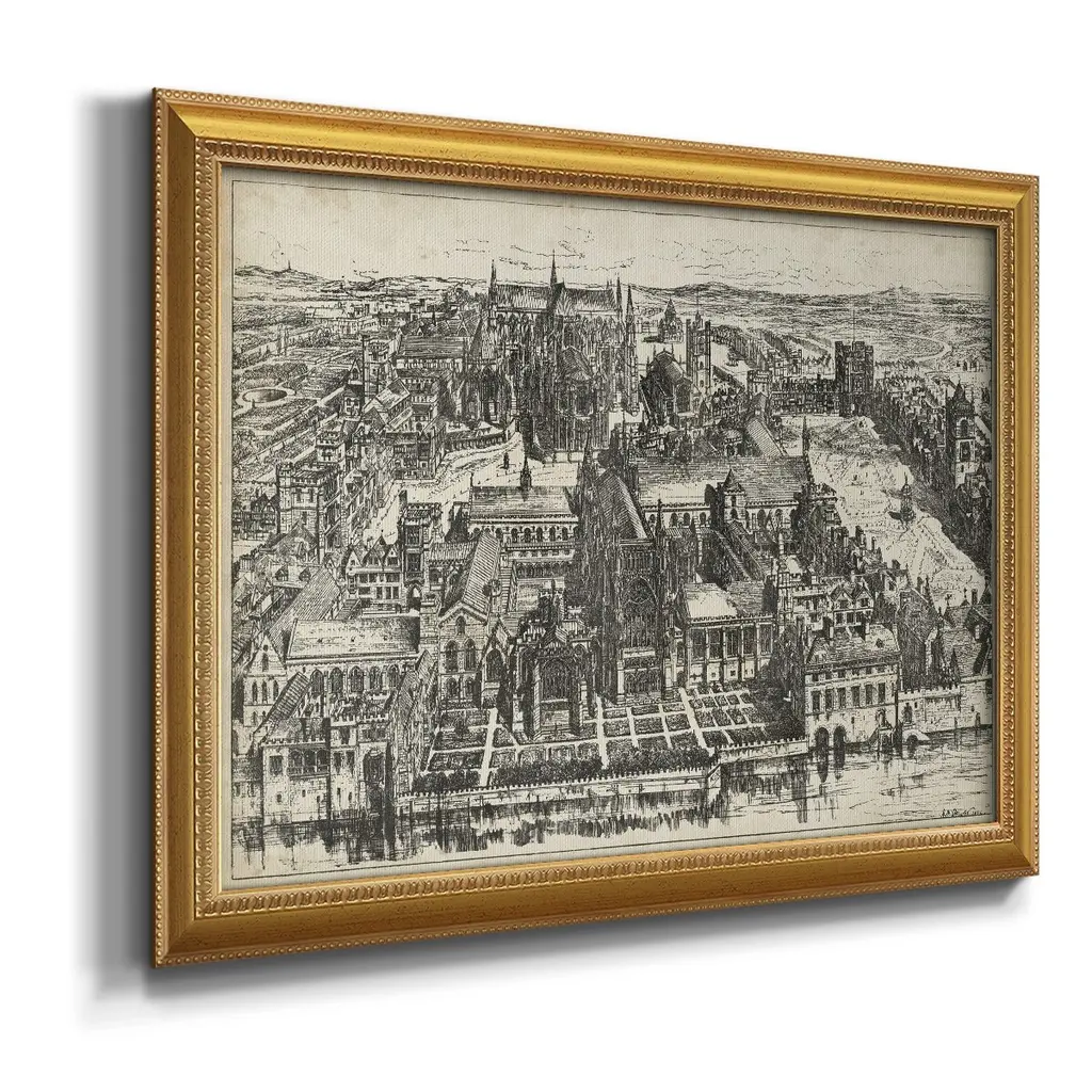 Bird's Eye View of London - Westminster Premium Framed Canvas- Ready to Hang A Premium Framed Canvas created to last. Framed in distressed wood and available in an array of sizes and colors Featuring a beveled a solid wood stretcher bar, each piece comes ready to hand 3 SIZES AVAILABLE 16''X20'' - Overall Size 18'X27'' - Overall Size 24''x36'' - Overall Size Each piece is made to order. Each piece comes with hanging hardware. Made in the USA Ready to Hang Giclee Paper Print Acrylic Glass Beveled Matt Board