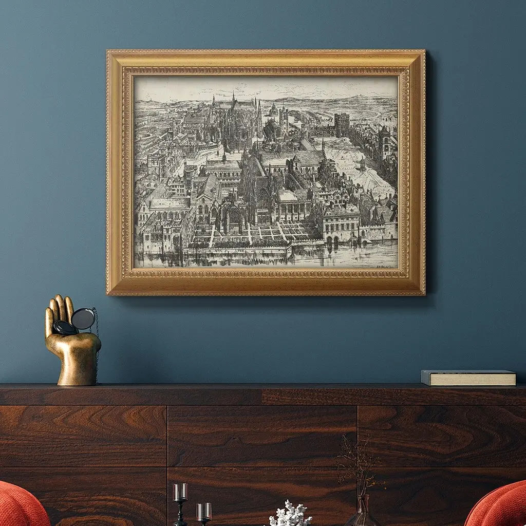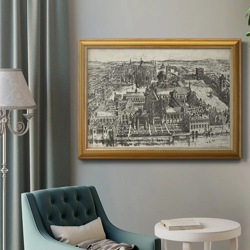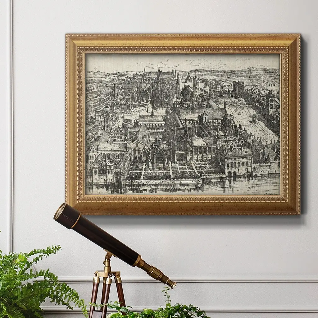 Bird's Eye View of London - Westminster Premium Framed Canvas- Ready to Hang A Premium Framed Canvas created to last. Framed in distressed wood and available in an array of sizes and colors Featuring a beveled a solid wood stretcher bar, each piece comes ready to hand 3 SIZES AVAILABLE 16''X20'' - Overall Size 18'X27'' - Overall Size 24''x36'' - Overall Size Each piece is made to order. Each piece comes with hanging hardware. Made in the USA Ready to Hang Giclee Paper Print Acrylic Glass Beveled Matt Board