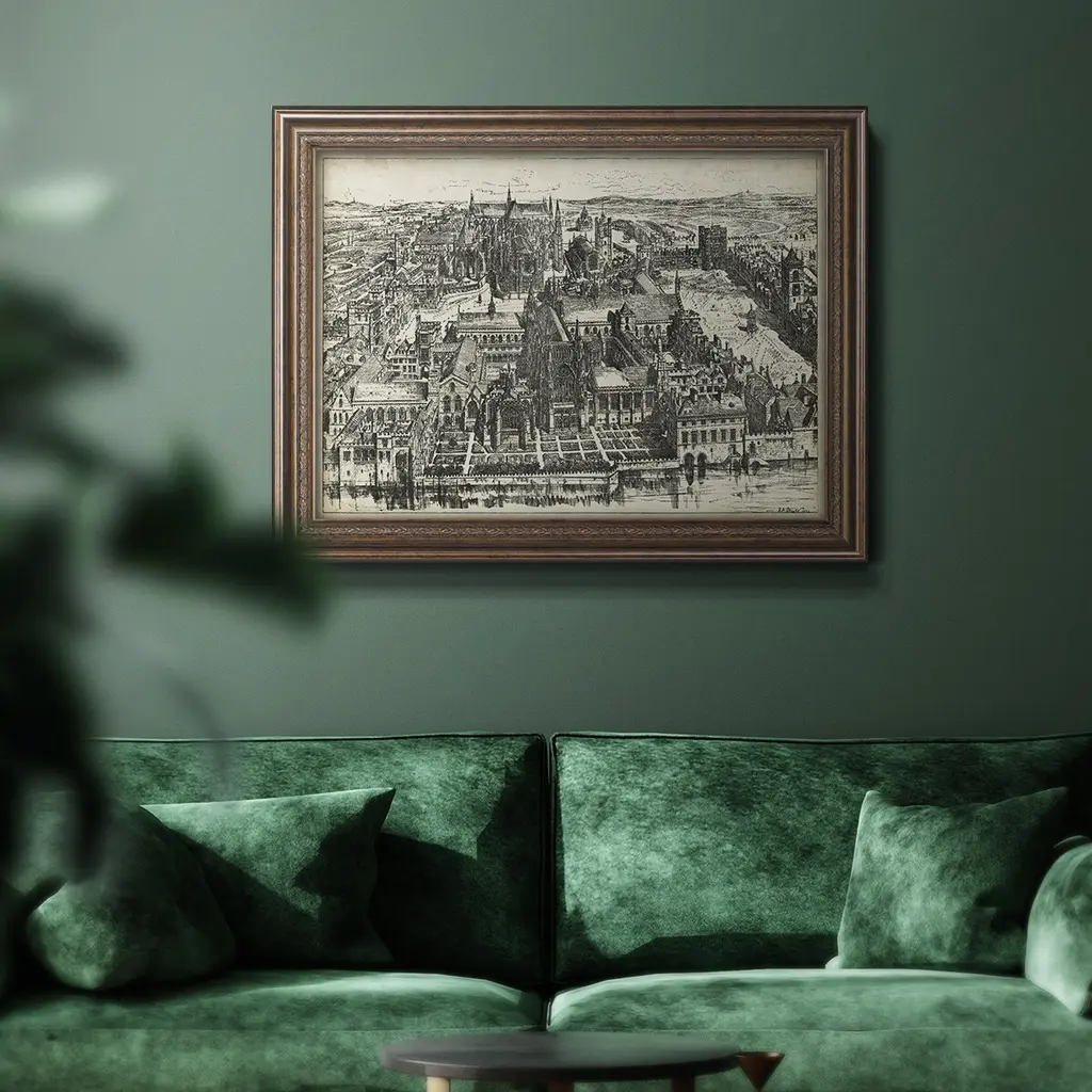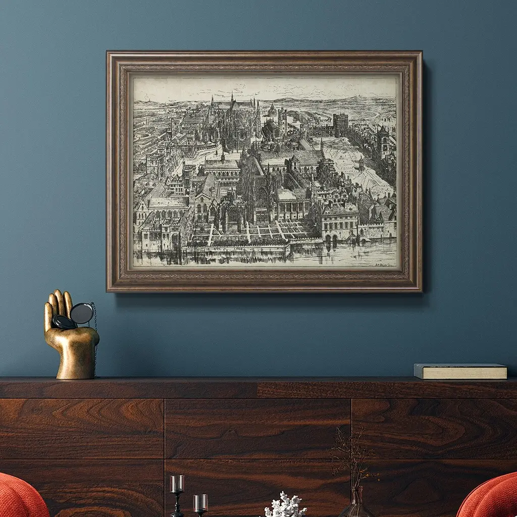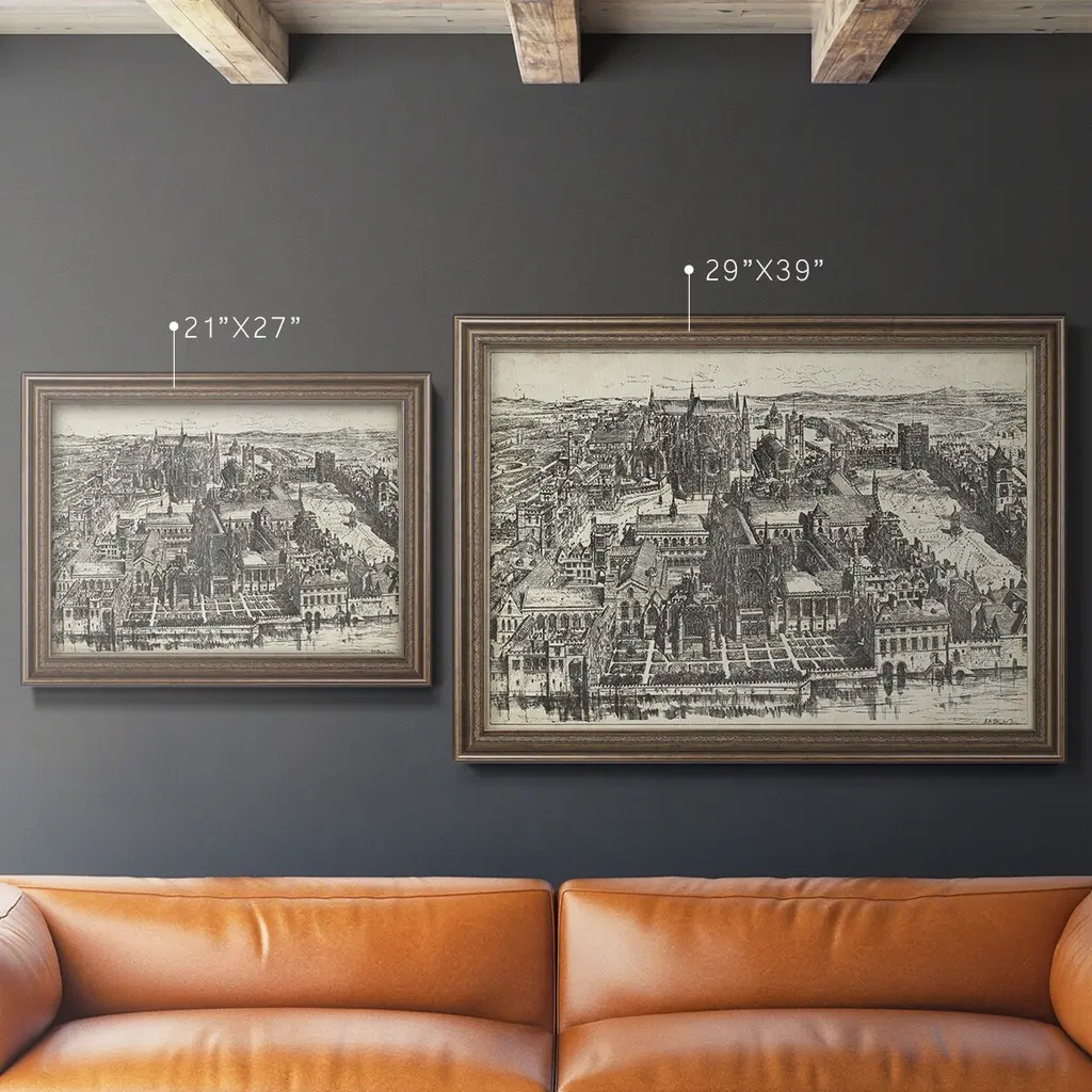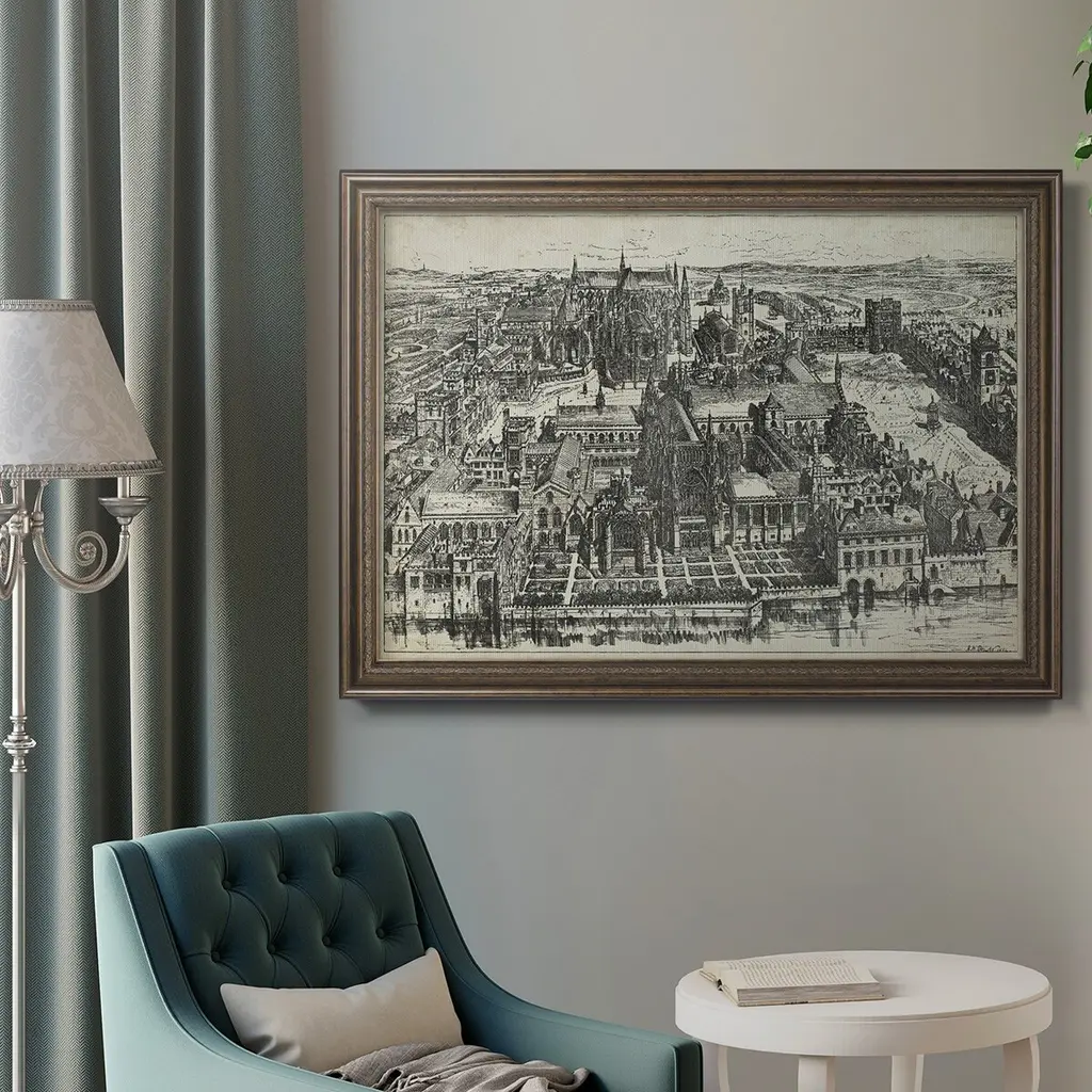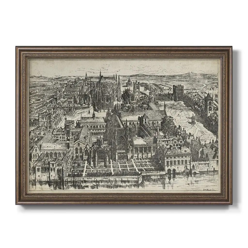 Bird's Eye View of London - Westminster Premium Framed Canvas- Ready to Hang A Premium Framed Canvas created to last. Framed in distressed wood and available in an array of sizes and colors Featuring a beveled a solid wood stretcher bar, each piece comes ready to hand 3 SIZES AVAILABLE 16''X20'' - Overall Size 18'X27'' - Overall Size 24''x36'' - Overall Size Each piece is made to order. Each piece comes with hanging hardware. Made in the USA Ready to Hang Giclee Paper Print Acrylic Glass Beveled Matt Board