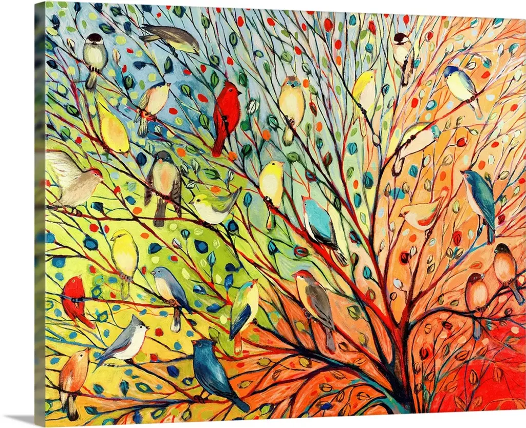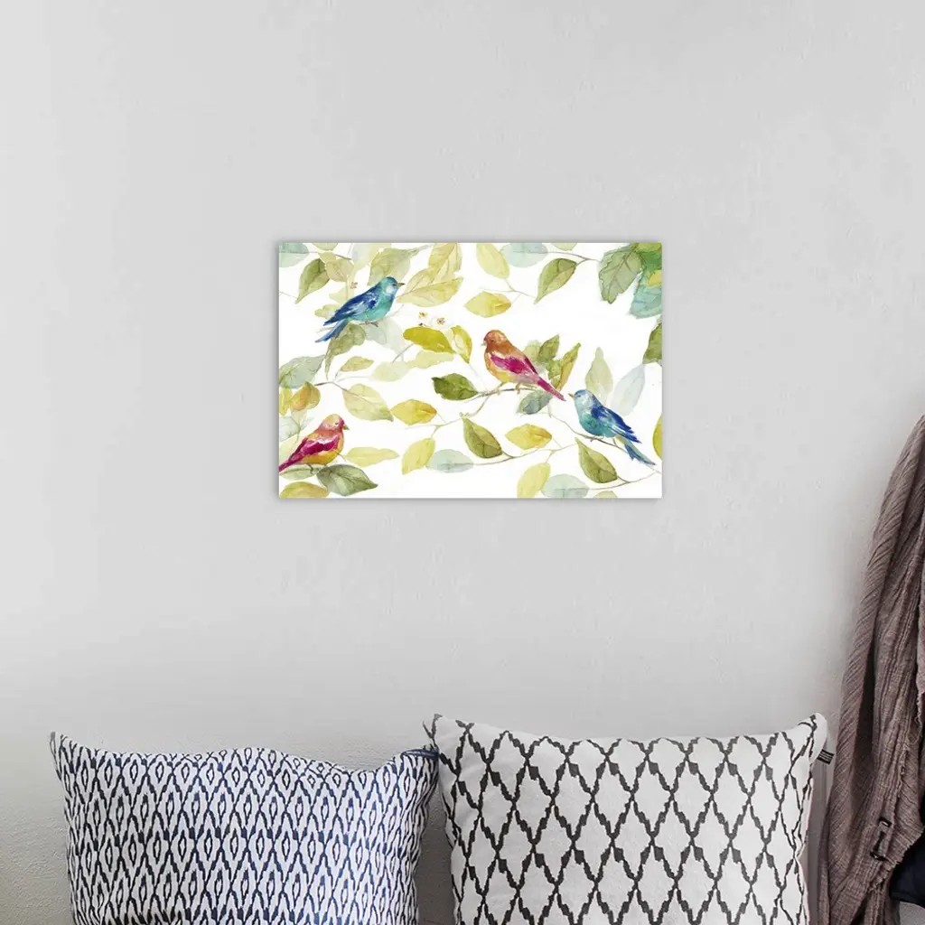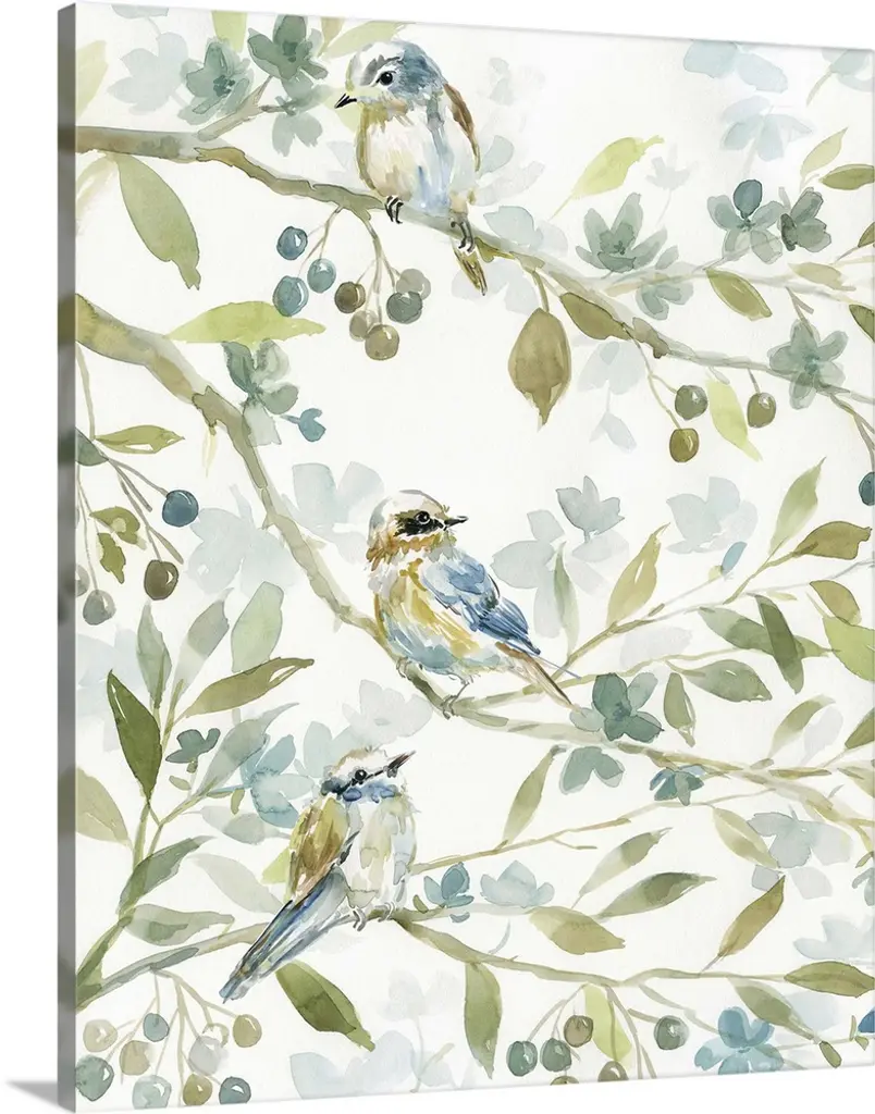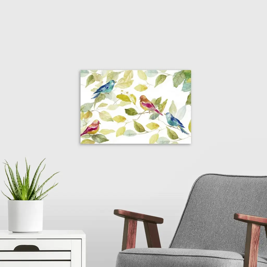 Contemporary watercolor painting of four birds perched on branches inside a tree and surrounded with green and blue toned leaves.