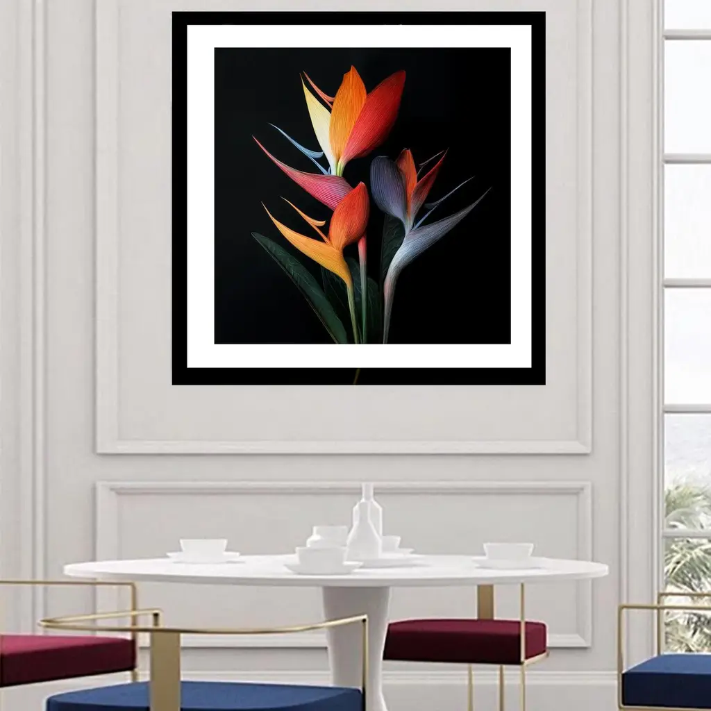 A striking cluster of Bird of Paradise flowers emerges from darkness, their sculpted petals glowing in fiery reds, oranges, yellows, and cool purples, with sleek green leaves adding contrast and elegance. Printed on 300gsm Archival Fine Art Paper.