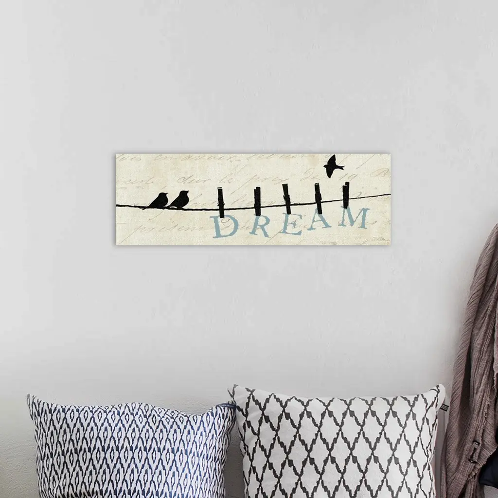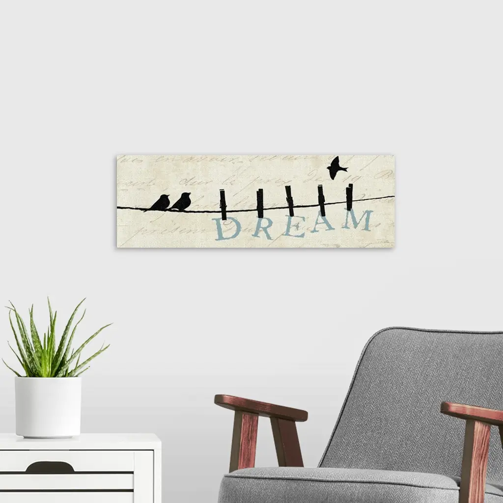 Contemporary artwork of silhouetted birds on a wire with the word "Dream" hanging from the line.