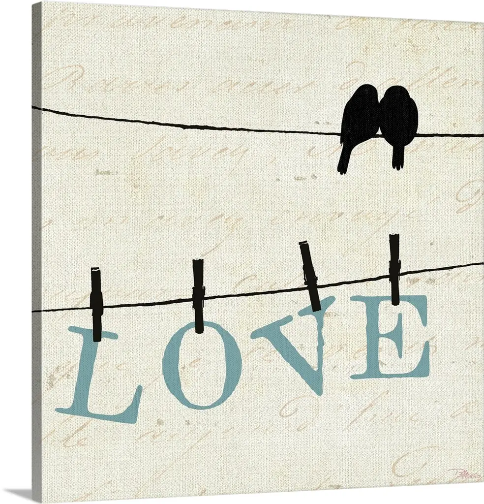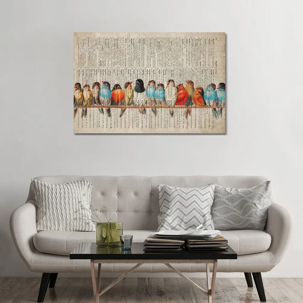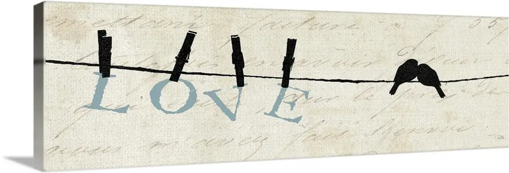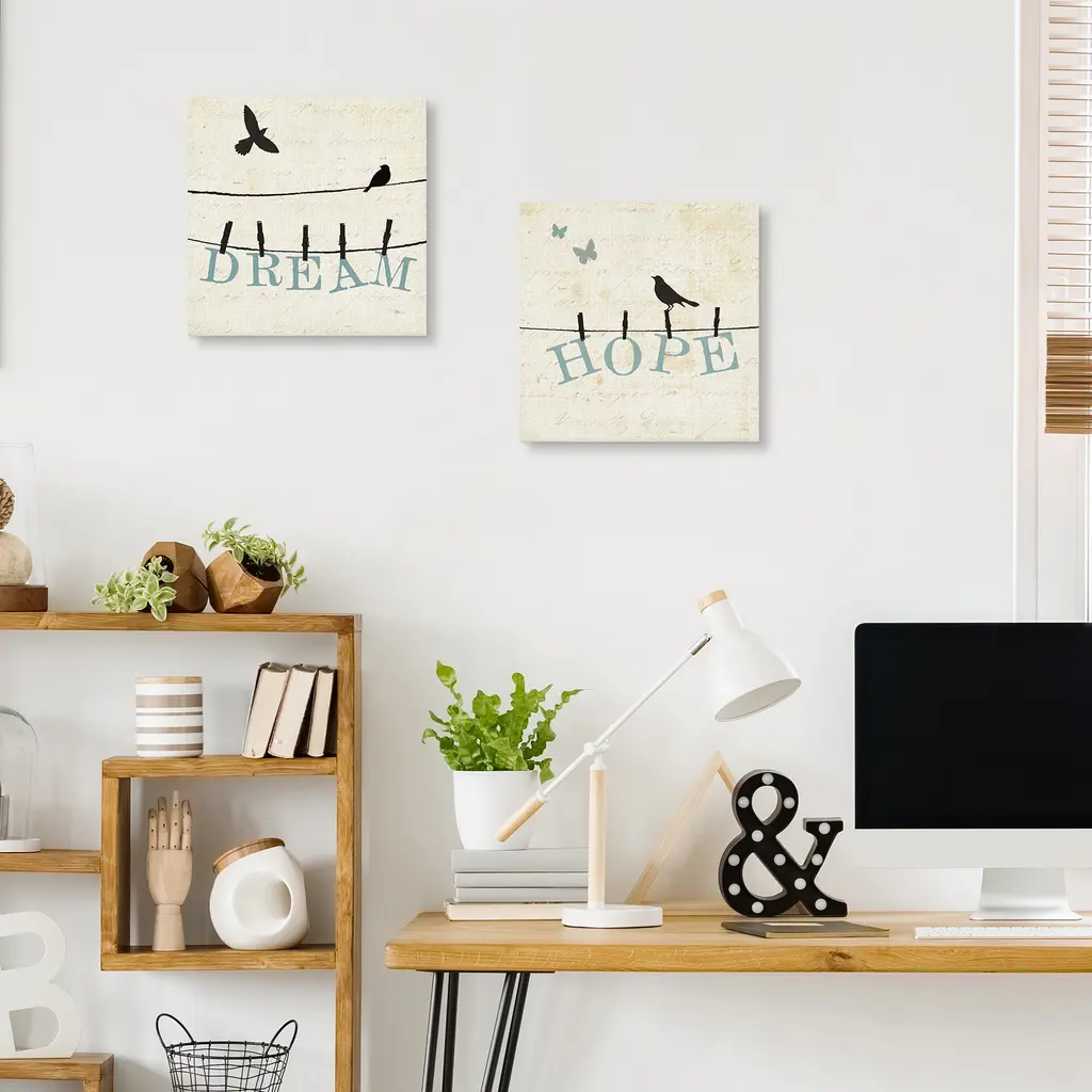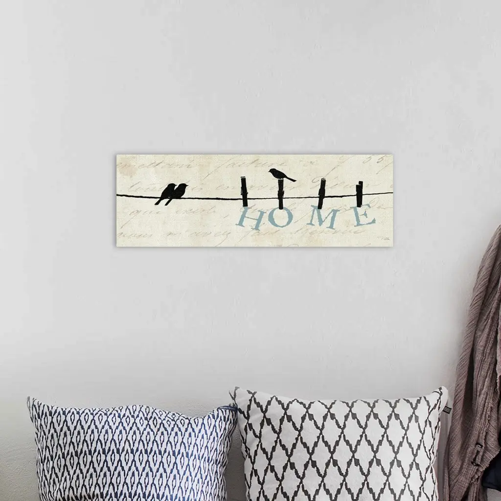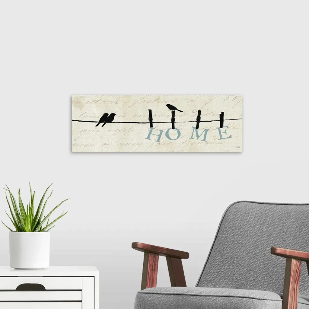 Contemporary artwork of silhouetted birds on a wire with the word "Home" hanging from the line.