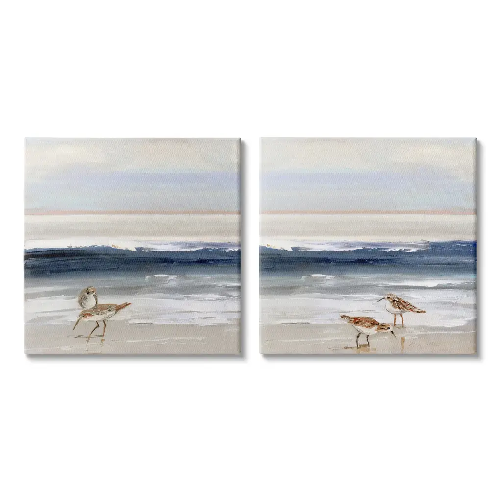 Birds On Beach Shore Ocean Waves Blue Sky Landscape, 2Pc, Each 12 X 12