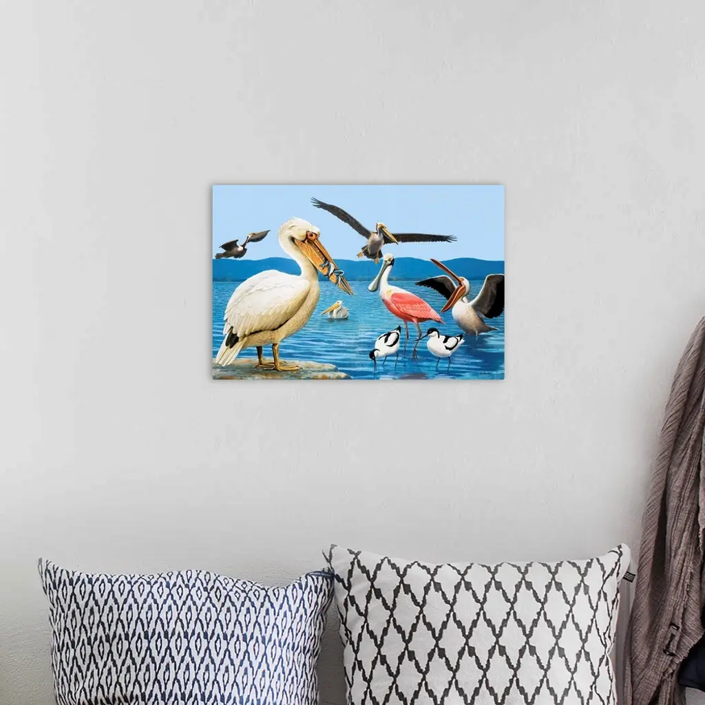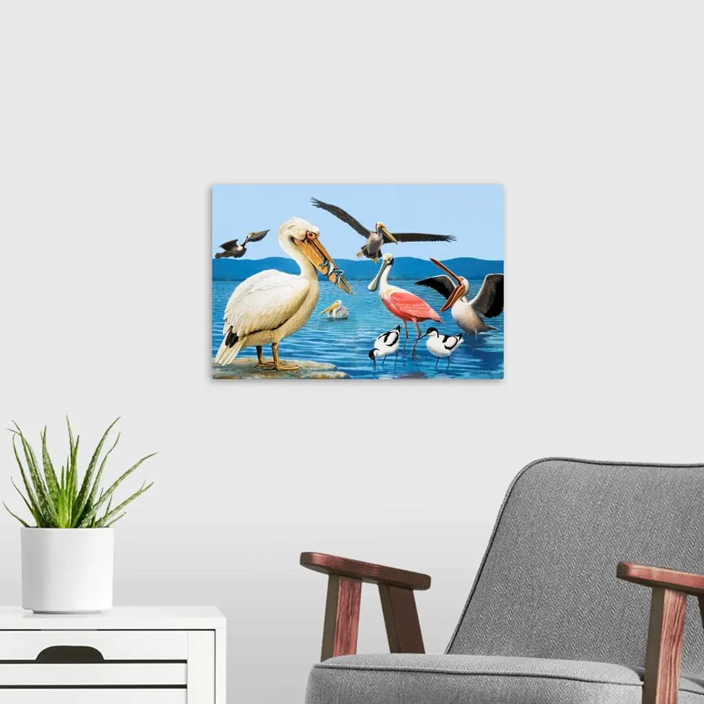 Birds with strange beaks. Pelican, Brown Pelican, Roseate Spoonbill, and Avocet. Original artwork for illustration on pp56-57 of Treasure annual 1972.