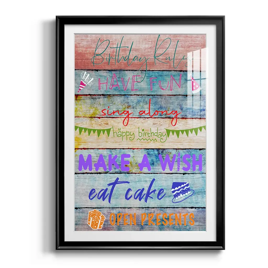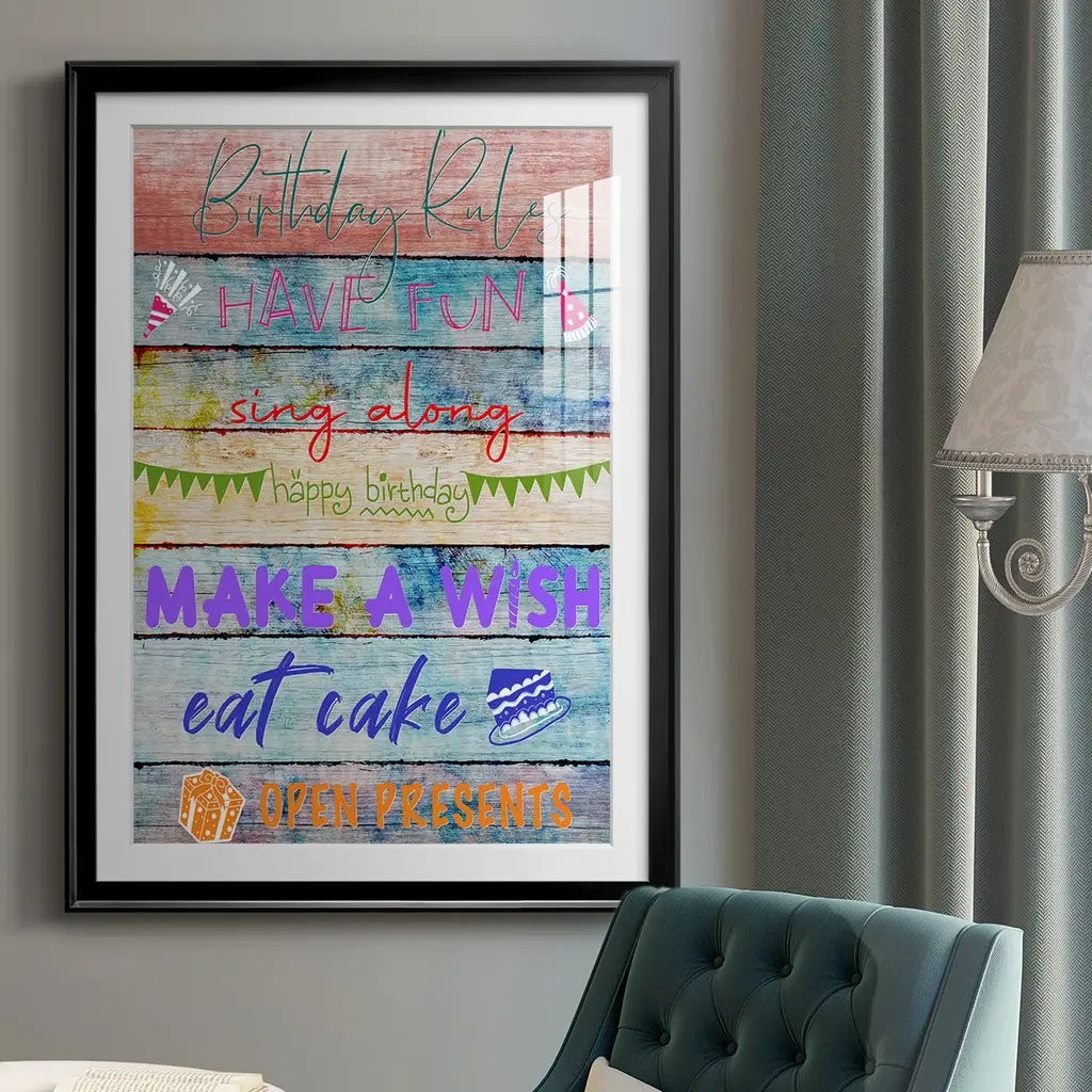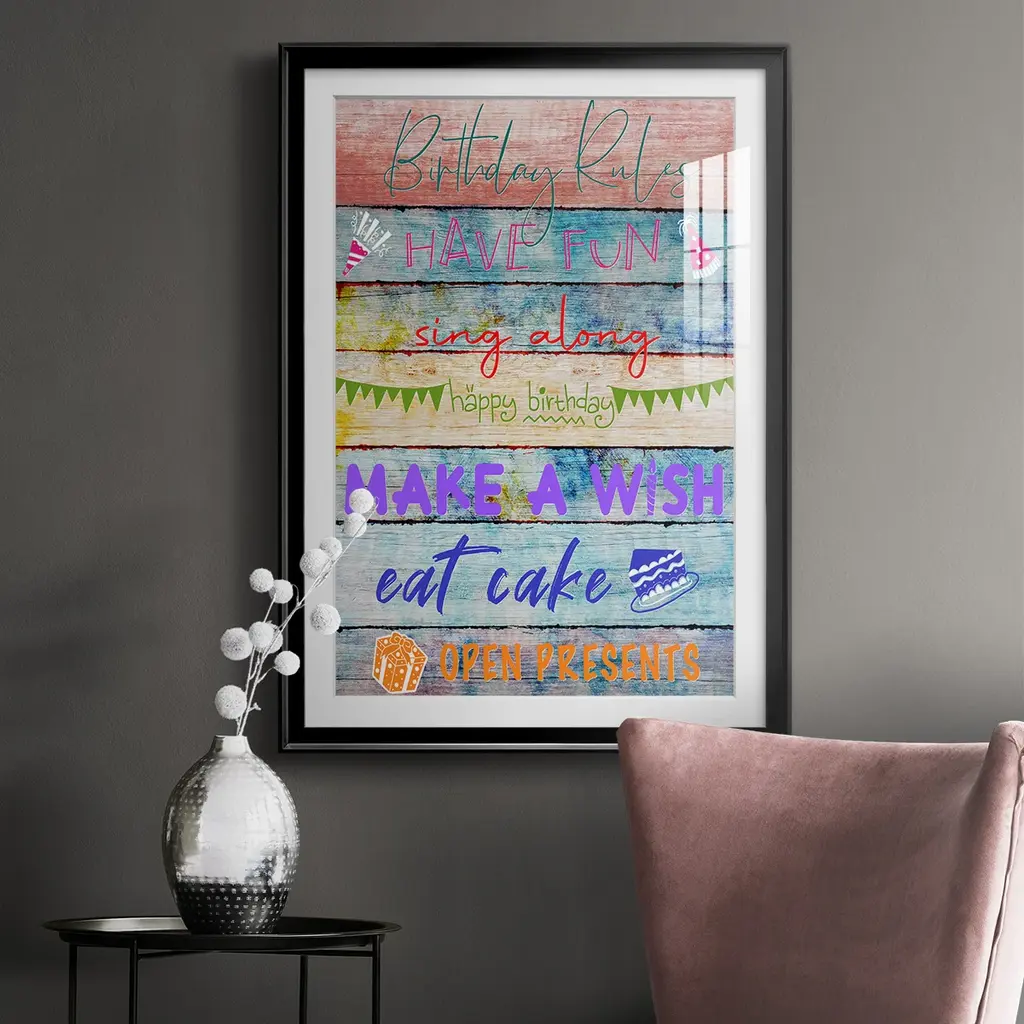 Birthday Rules Premium Framed Print - Ready to Hang A Premium Framed Print created to last. Framed in distressed wood and available in an array of sizes and colors Featuring a beveled a solid wood stretcher bar, each piece comes ready to hand 4 SIZES AVAILABLE 30.5''X42.5'' - Overall Size 26.5'X36.5'' - Overall Size 22.5''x30.5'' - Overall Size 18.5''x24.5'' - Overall Size Each piece is made to order. Each piece comes with hanging hardware. Made in the USA Ready to Hang Giclee Paper Print Acrylic Glass Beveled Matt Board