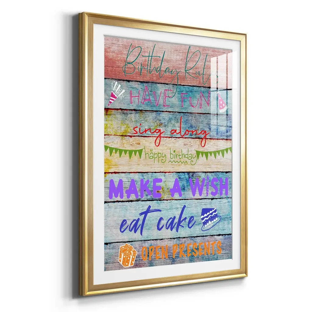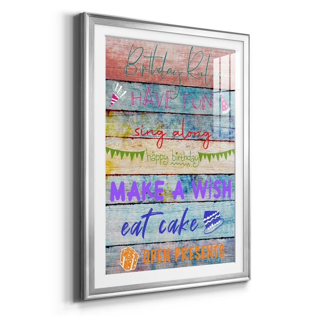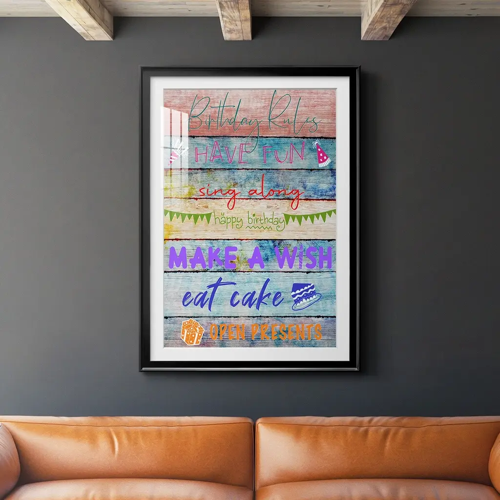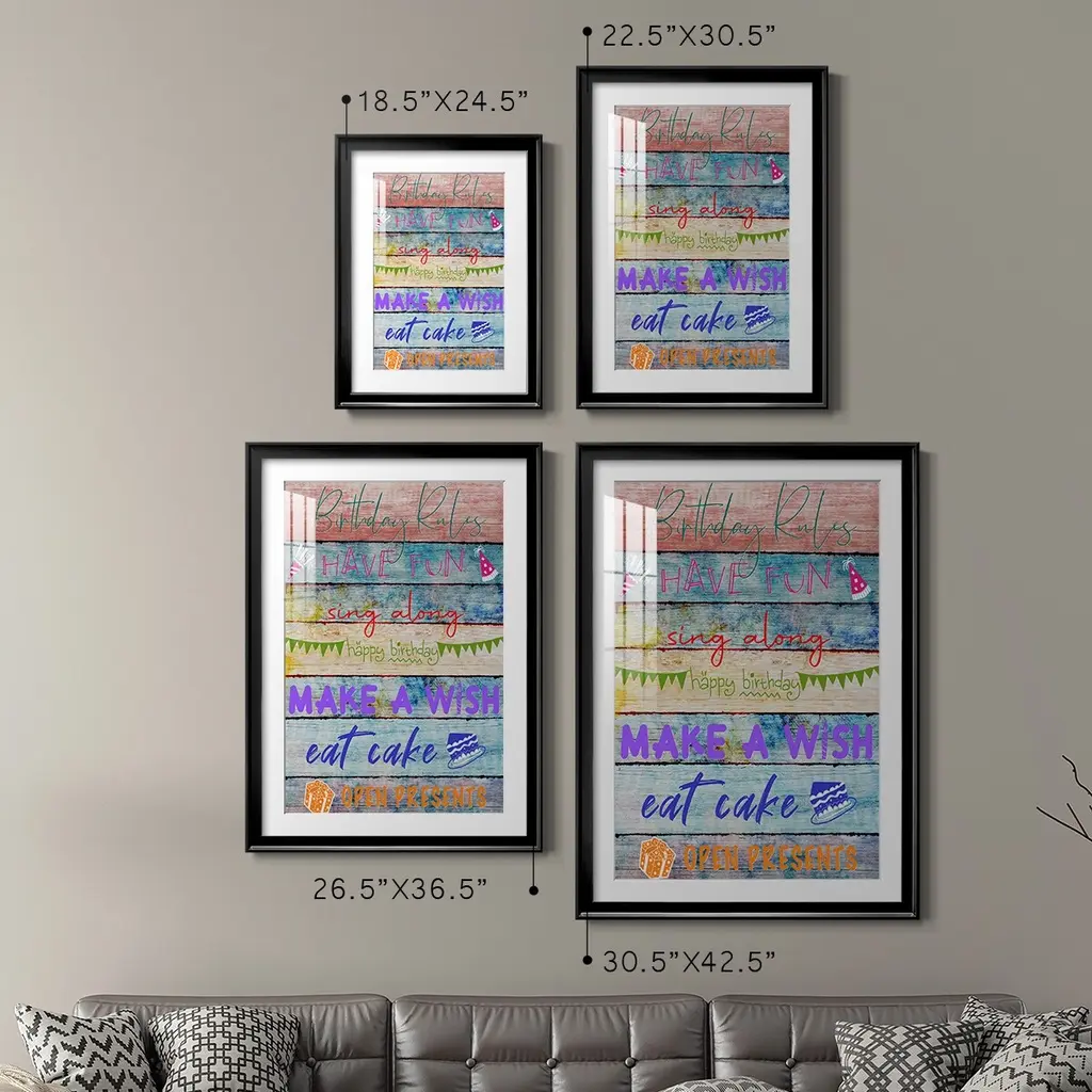 Birthday Rules Premium Framed Print - Ready to Hang A Premium Framed Print created to last. Framed in distressed wood and available in an array of sizes and colors Featuring a beveled a solid wood stretcher bar, each piece comes ready to hand 4 SIZES AVAILABLE 30.5''X42.5'' - Overall Size 26.5'X36.5'' - Overall Size 22.5''x30.5'' - Overall Size 18.5''x24.5'' - Overall Size Each piece is made to order. Each piece comes with hanging hardware. Made in the USA Ready to Hang Giclee Paper Print Acrylic Glass Beveled Matt Board
