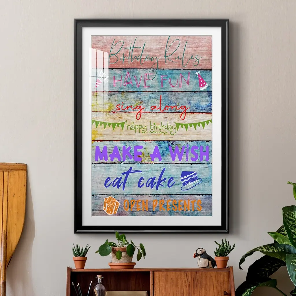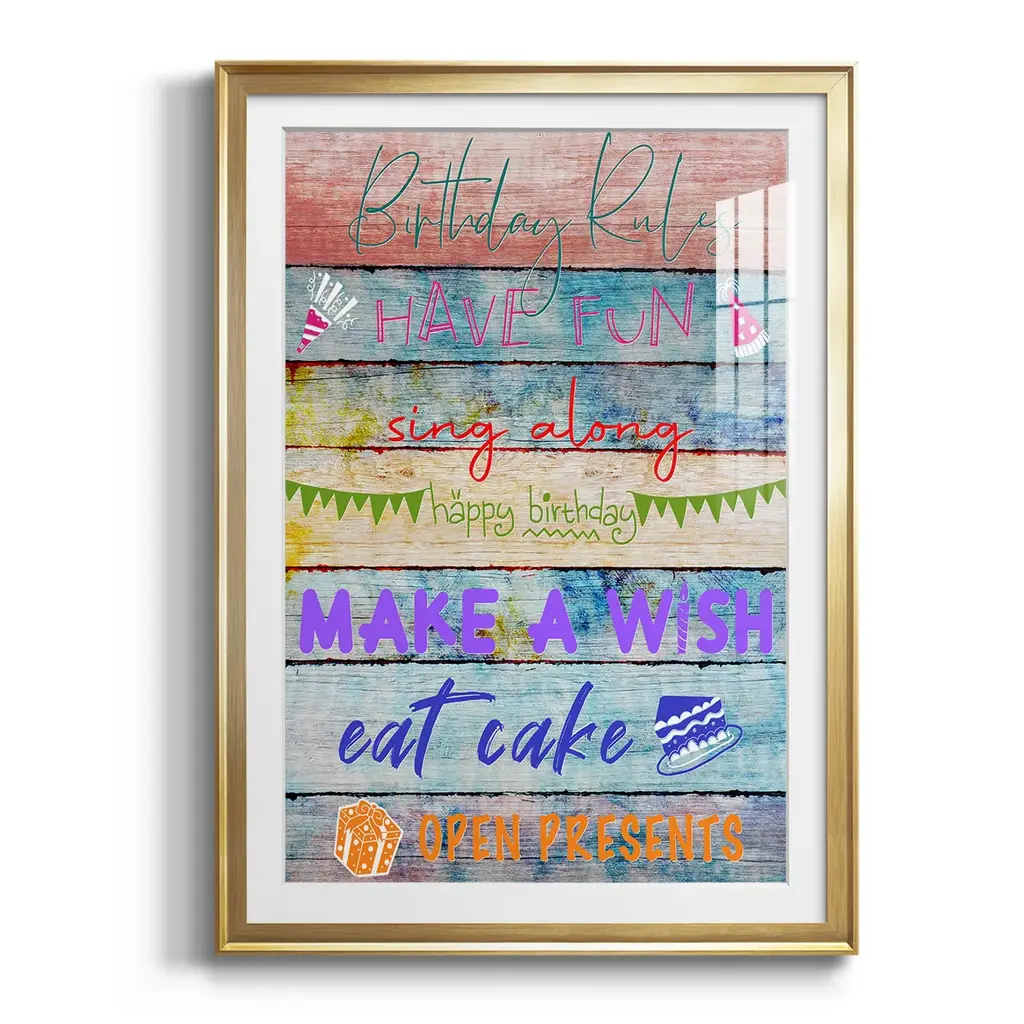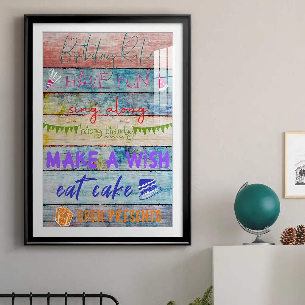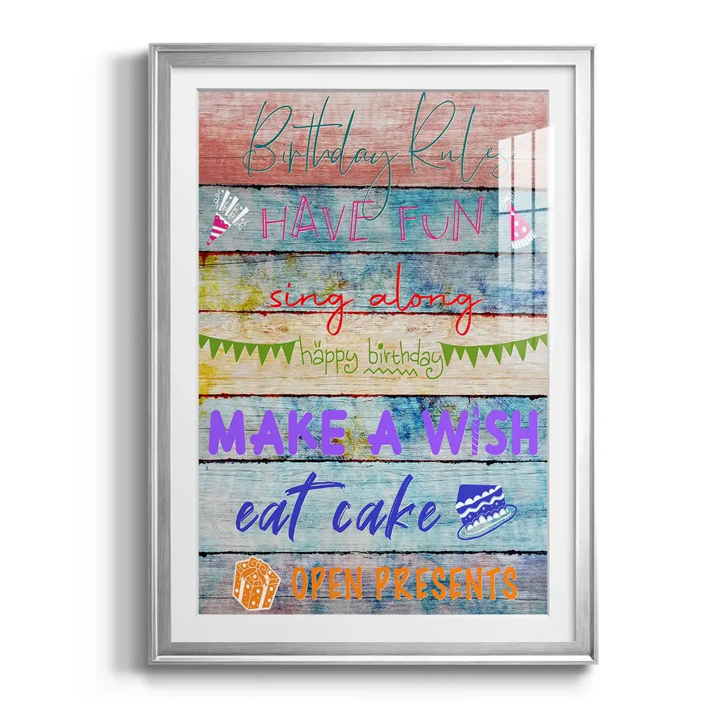Birthday Rules Premium Framed Print - Ready to Hang A Premium Framed Print created to last. Framed in distressed wood and available in an array of sizes and colors Featuring a beveled a solid wood stretcher bar, each piece comes ready to hand 4 SIZES AVAILABLE 30.5''X42.5'' - Overall Size 26.5'X36.5'' - Overall Size 22.5''x30.5'' - Overall Size 18.5''x24.5'' - Overall Size Each piece is made to order. Each piece comes with hanging hardware. Made in the USA Ready to Hang Giclee Paper Print Acrylic Glass Beveled Matt Board