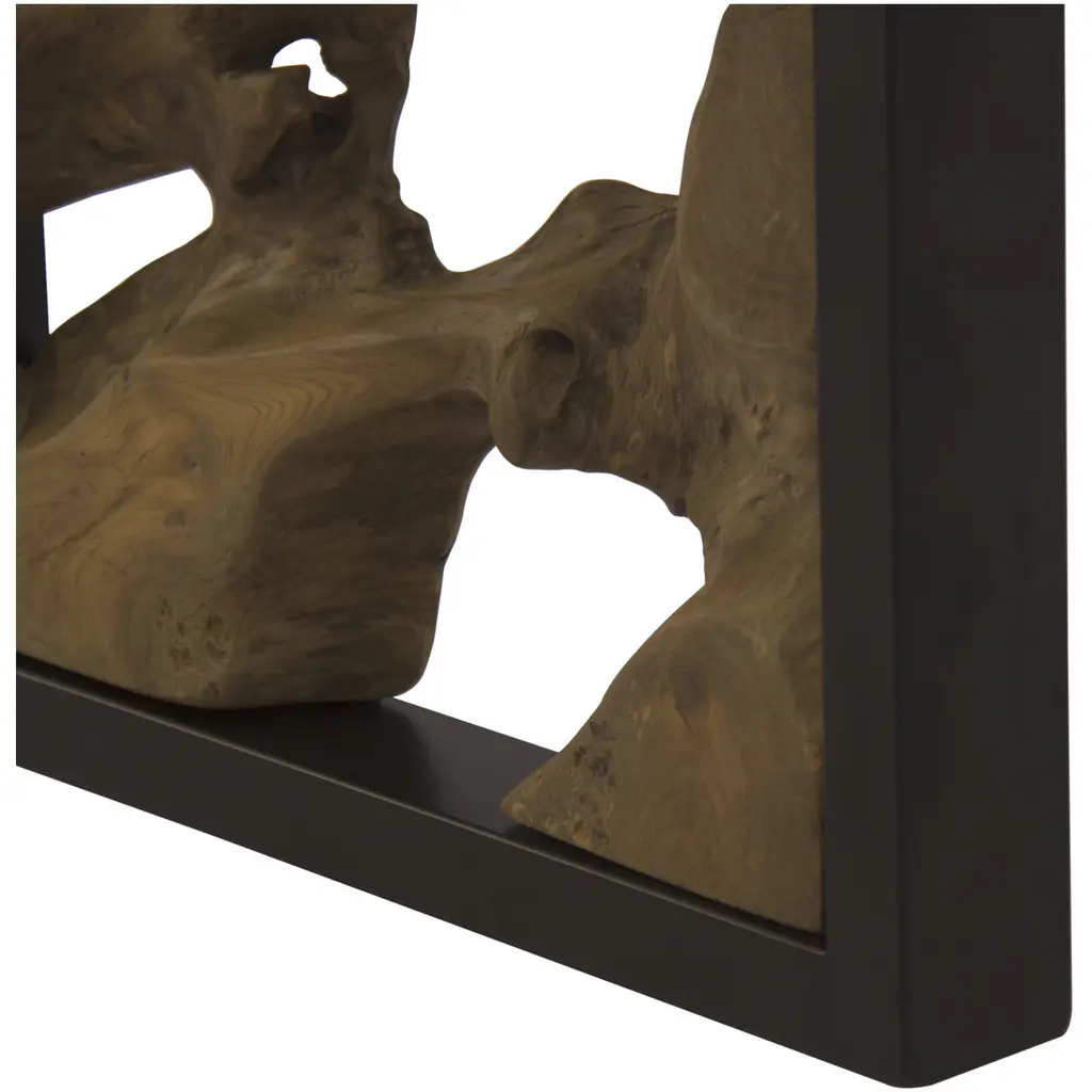 The organic artistry of teak root, featured within these three wall art pieces, shines brightly within the modern rustic interior. The black powder-coated iron frames fulfill their duty of complementing the subjects, thanks to their sleek, minimal style. Hanging side by side or above one another, the set tells a different story with each new arrangement.