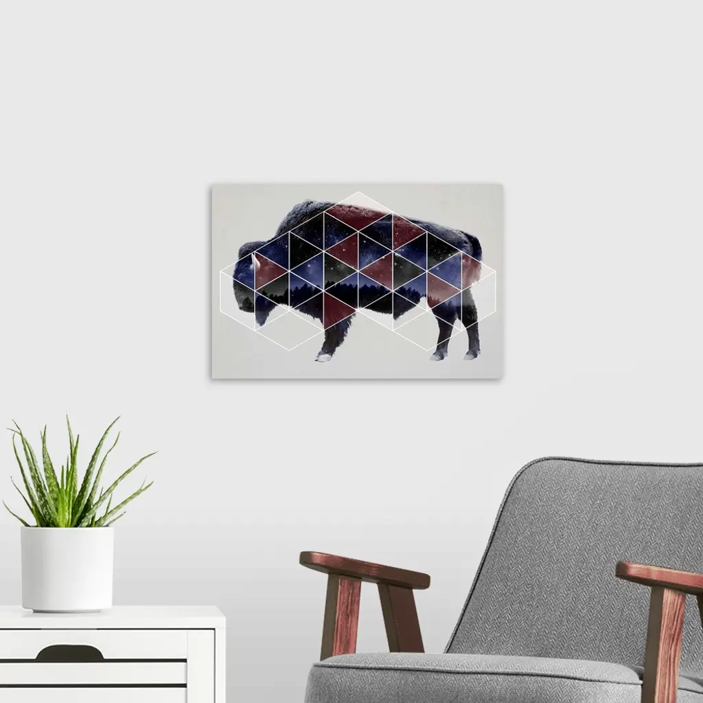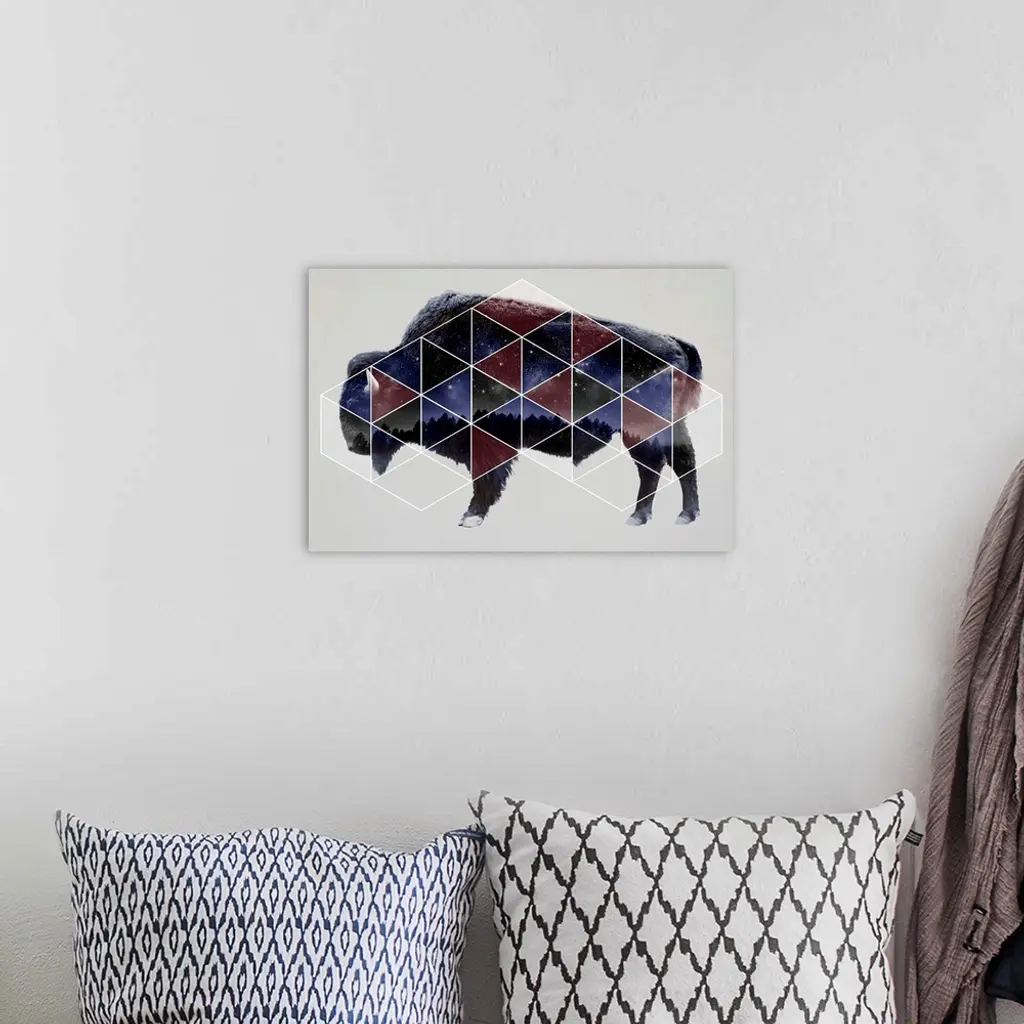Double exposure artwork of a bison in profile with a triangular pattern and the night sky.