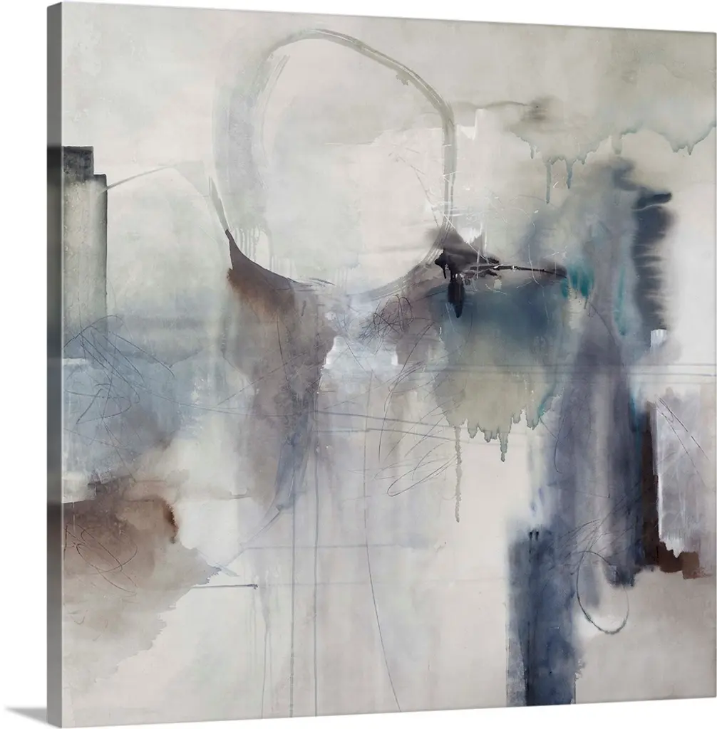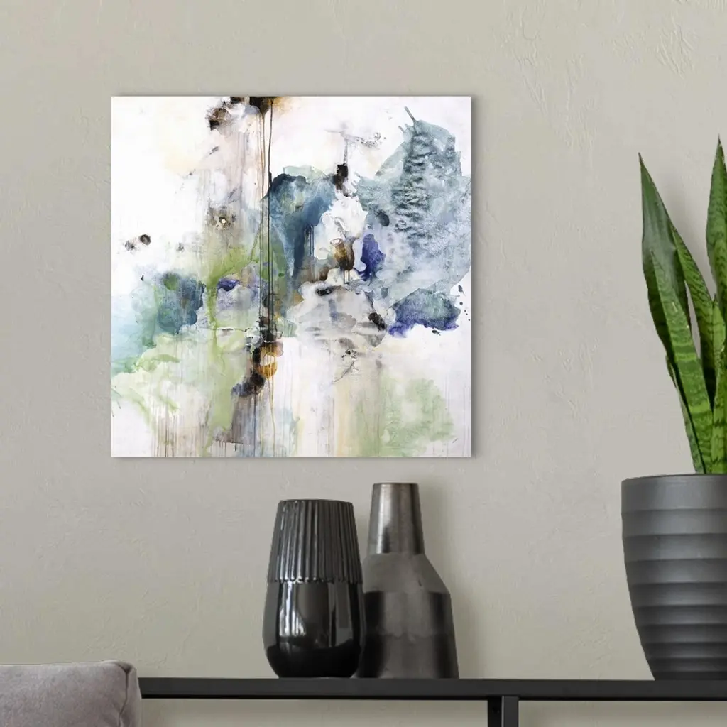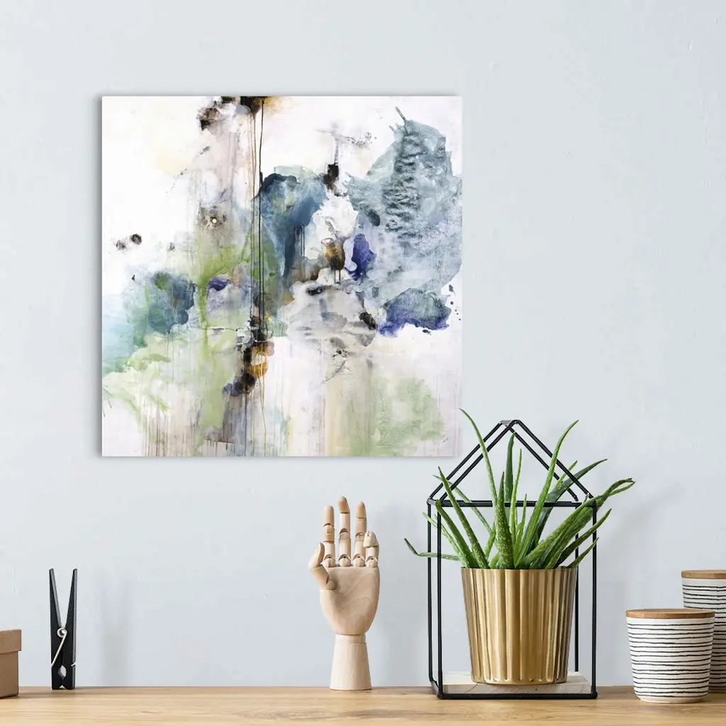 Square abstract painting in green and blue with textured drips of paint.