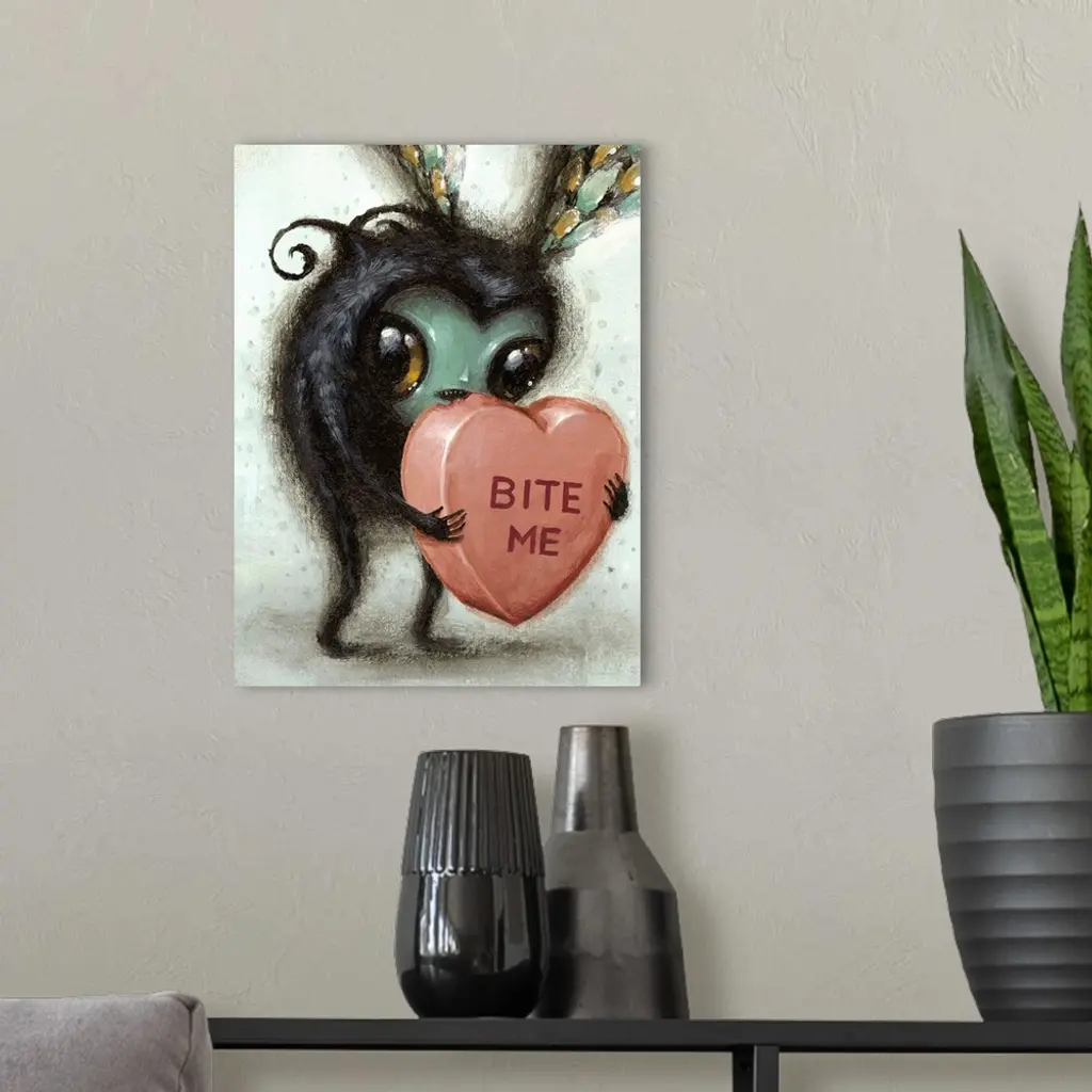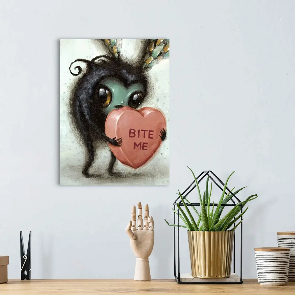 Surrealist painting of an insect-like creature holding a heart-shaped candy.
