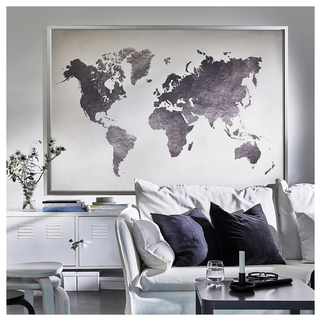 BJÖRKSTA Picture and frame - the world/aluminum color 78 ¾x55 ". Choose the look of your picture by either having the frame visible or folding the canvas around the frame. If you want some variation, you can easily change the motif or put textiles in the frame.