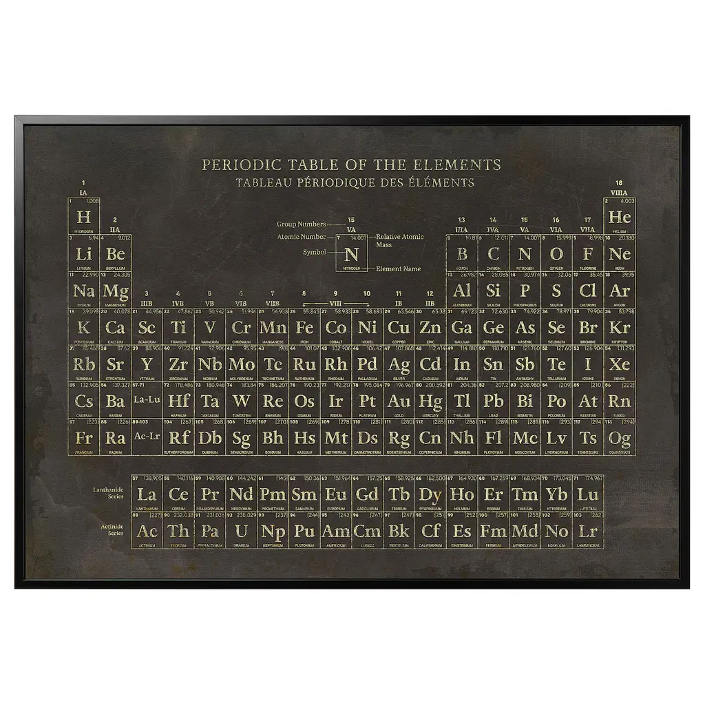 BJÖRKSTA Picture and frame - periodic table/black 78 ¾x55 ". This BJÖRKSTA canvas combines a brown vintage feeling with yellow-gold letters and numbers. Depending on lighting and distance, the colors may be perceived differently. The picture and frame come in separate packages.