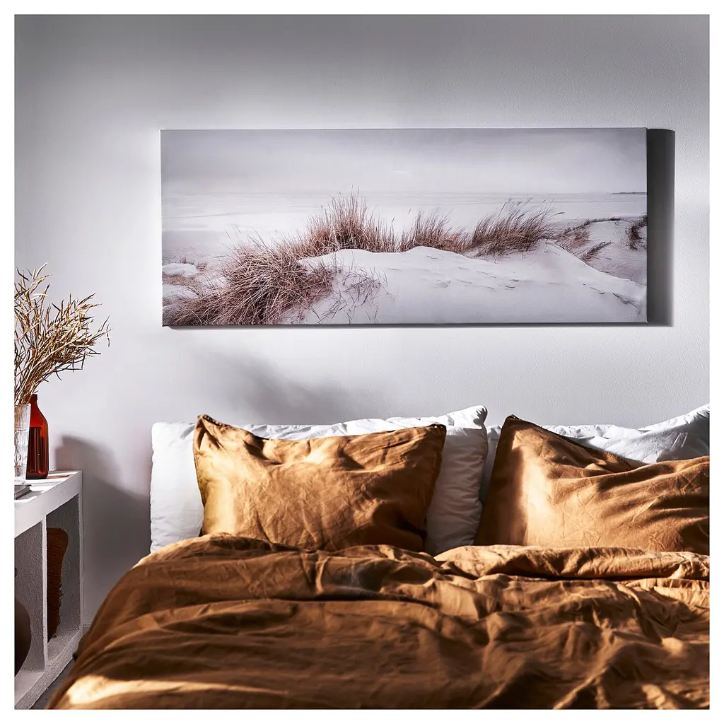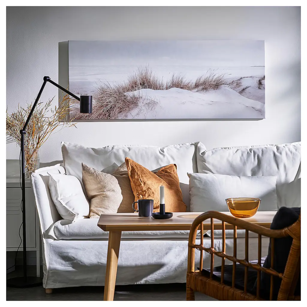 BJÖRKSTA Picture and frame - sand dunes/aluminum color 55x22 ". Motif created by Assaf Frank. Choose the look of your picture by either having the frame visible or folding the canvas around the frame. If you want some variation, you can easily change the motif or put textiles in the frame.