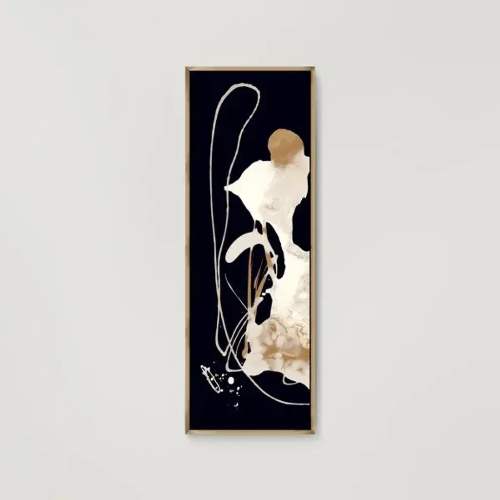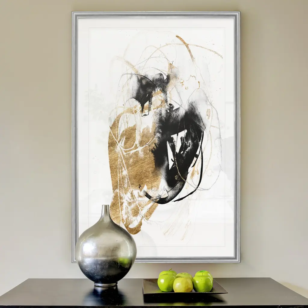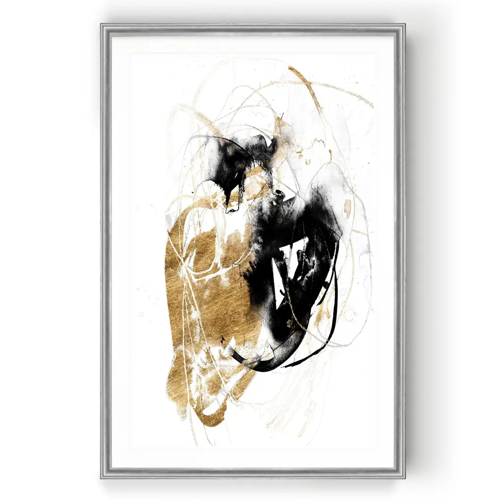 Black & Gold Splash III -Custom Framed Print A premium custom framed giclee print Featuring a beveled a matt , acrylic glass, and a high quality giclee print 4 SIZES AVAILABLE 18''x24''- Overall Size 22''x30'' - Overall Size 26''x36''' - Overall Size 30''x42''' - Overall Size Each piece is made to order. Built to Last Each piece comes ready to hang Fade and Water resistant Made domestically