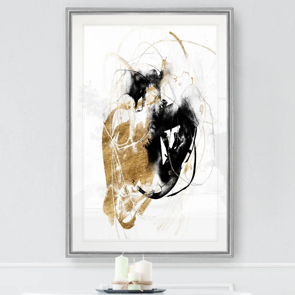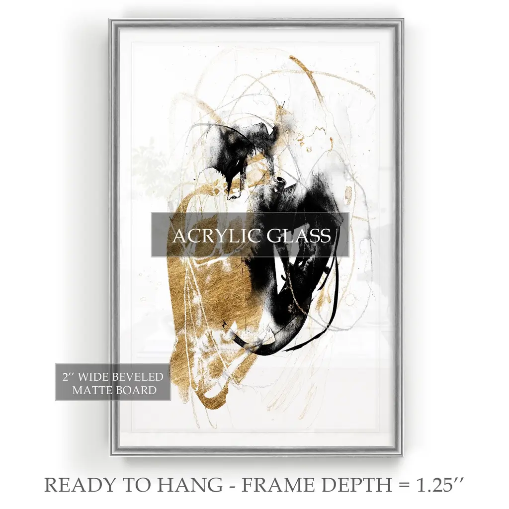 Black & Gold Splash III -Custom Framed Print A premium custom framed giclee print Featuring a beveled a matt , acrylic glass, and a high quality giclee print 4 SIZES AVAILABLE 18''x24''- Overall Size 22''x30'' - Overall Size 26''x36''' - Overall Size 30''x42''' - Overall Size Each piece is made to order. Built to Last Each piece comes ready to hang Fade and Water resistant Made domestically
