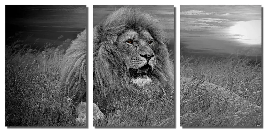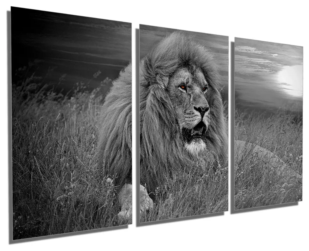 36" x 18" total size. Ready To Hang! (3 pieces - 12" x 18" each). 3 Panel Split (Triptych) Metal Print of an African Lion in a during sunset. Black and White with colored eyes. Modern metal wall art for home or office wall decor & interior design. Printed on Luxurious, HD aluminum glossy metal panels. Multi panel art.. HD aluminum panels. Metal print wall art. Includes Shadow Wall Mount on the back.• Aluminum Metal Wall Art• Made in USA• Ready to hang - No assembly required• Shadow mount hardware on the back• 0.045" thick HD Aluminum Panels• Scratch resistant, glossy finish• Superb color clarity, luxurious prints• Epson printing process• For indoor or moisture rich environment use• Easy to clean. Gently wipe with microfiber cloth.