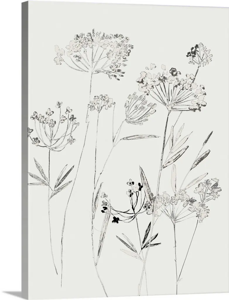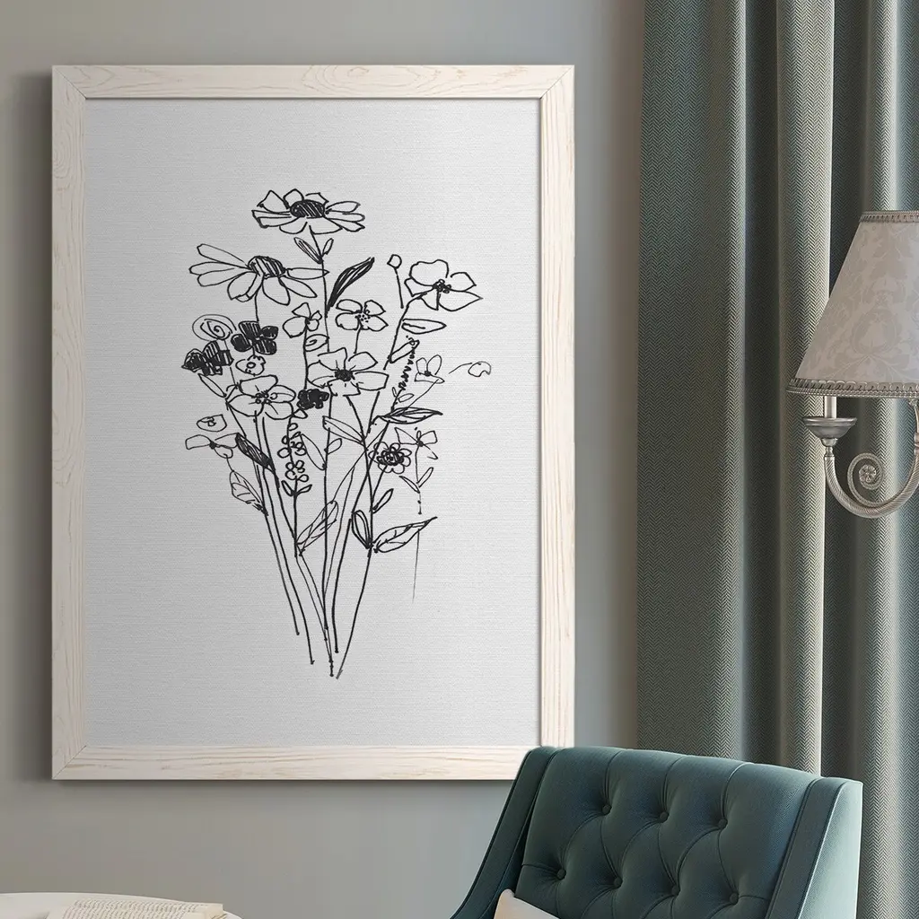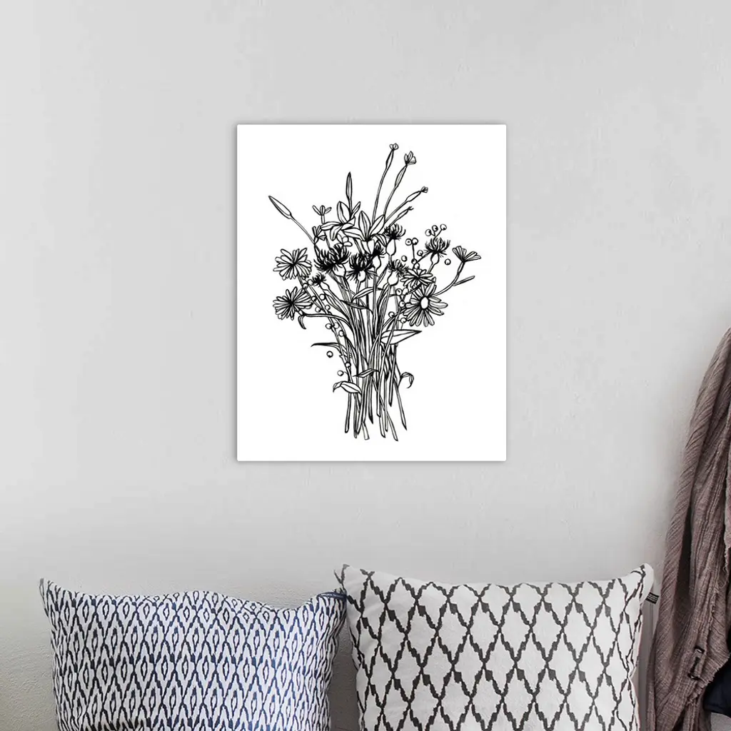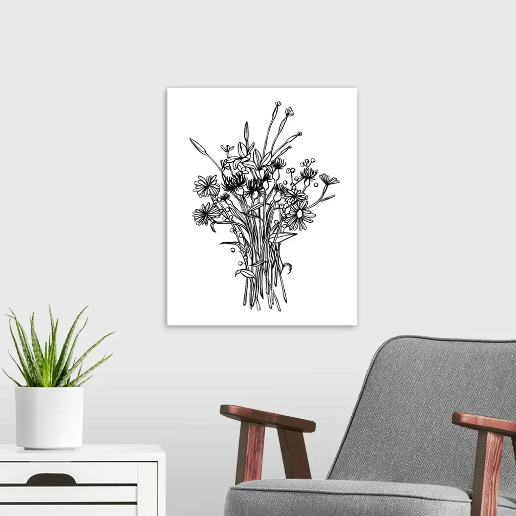 Contemporary painting of a floral bouquet outlined in black on a white background.
