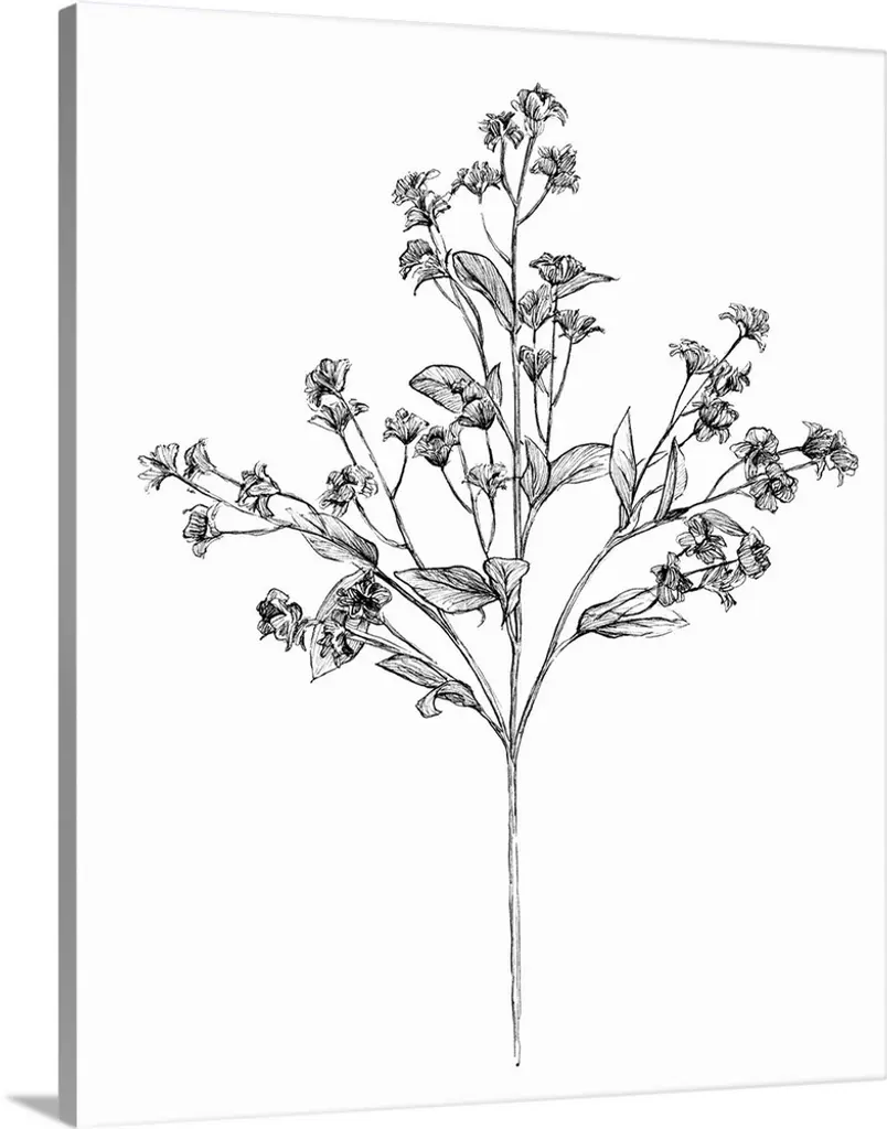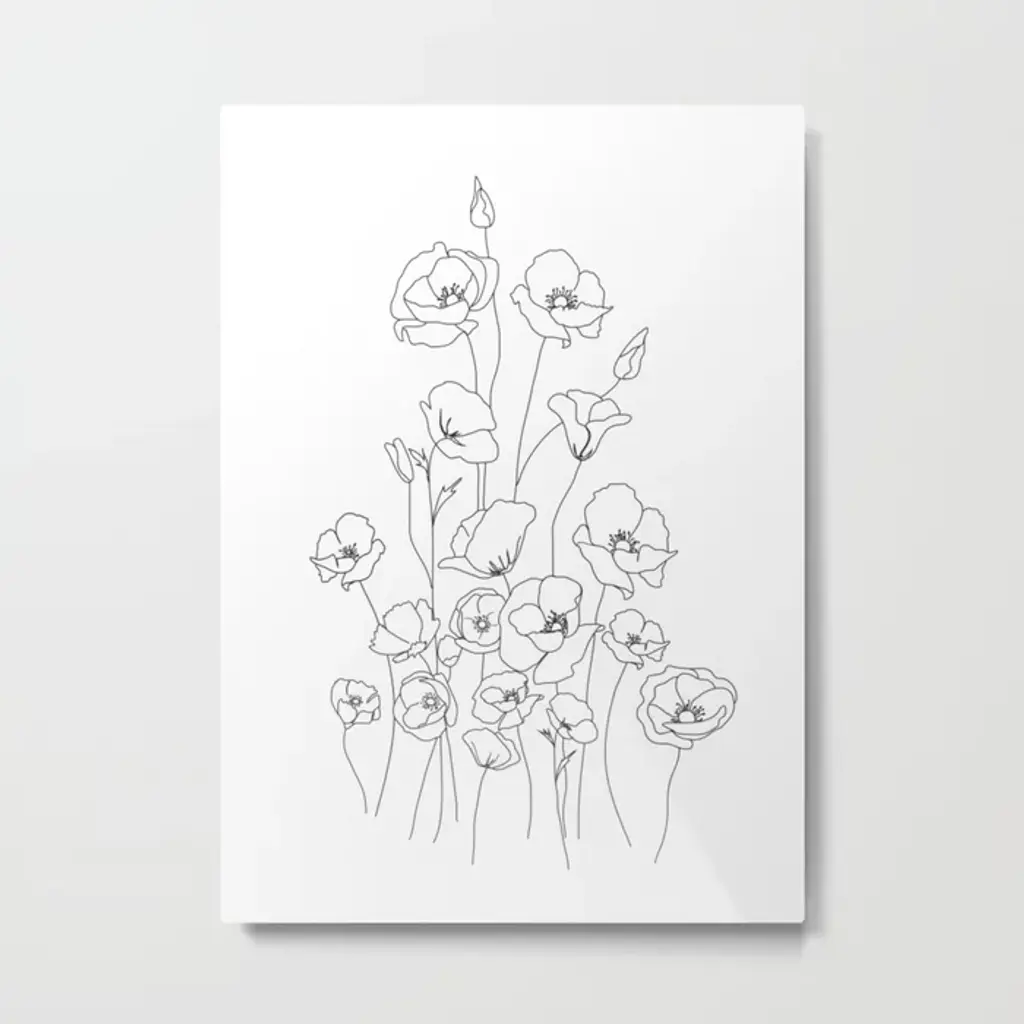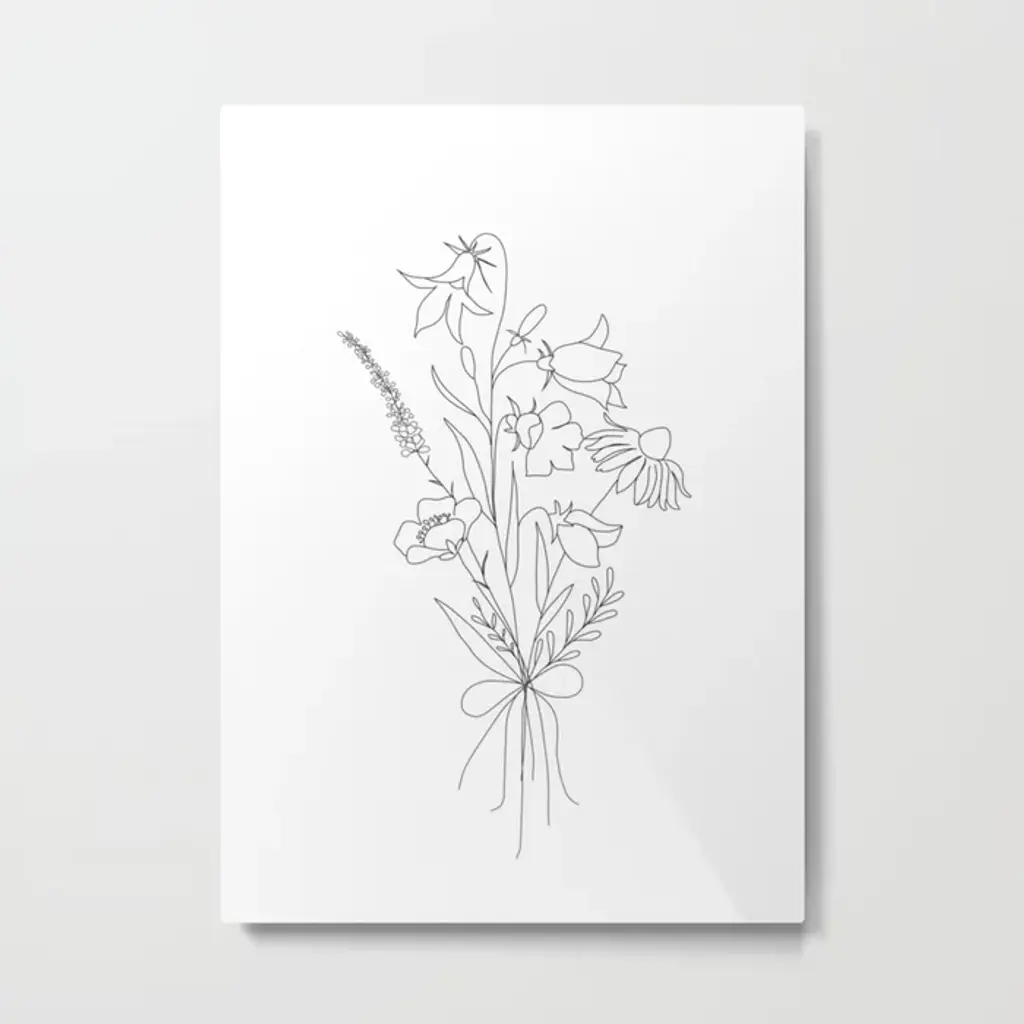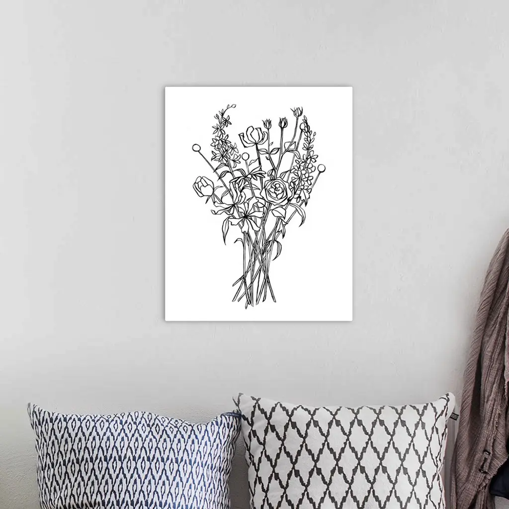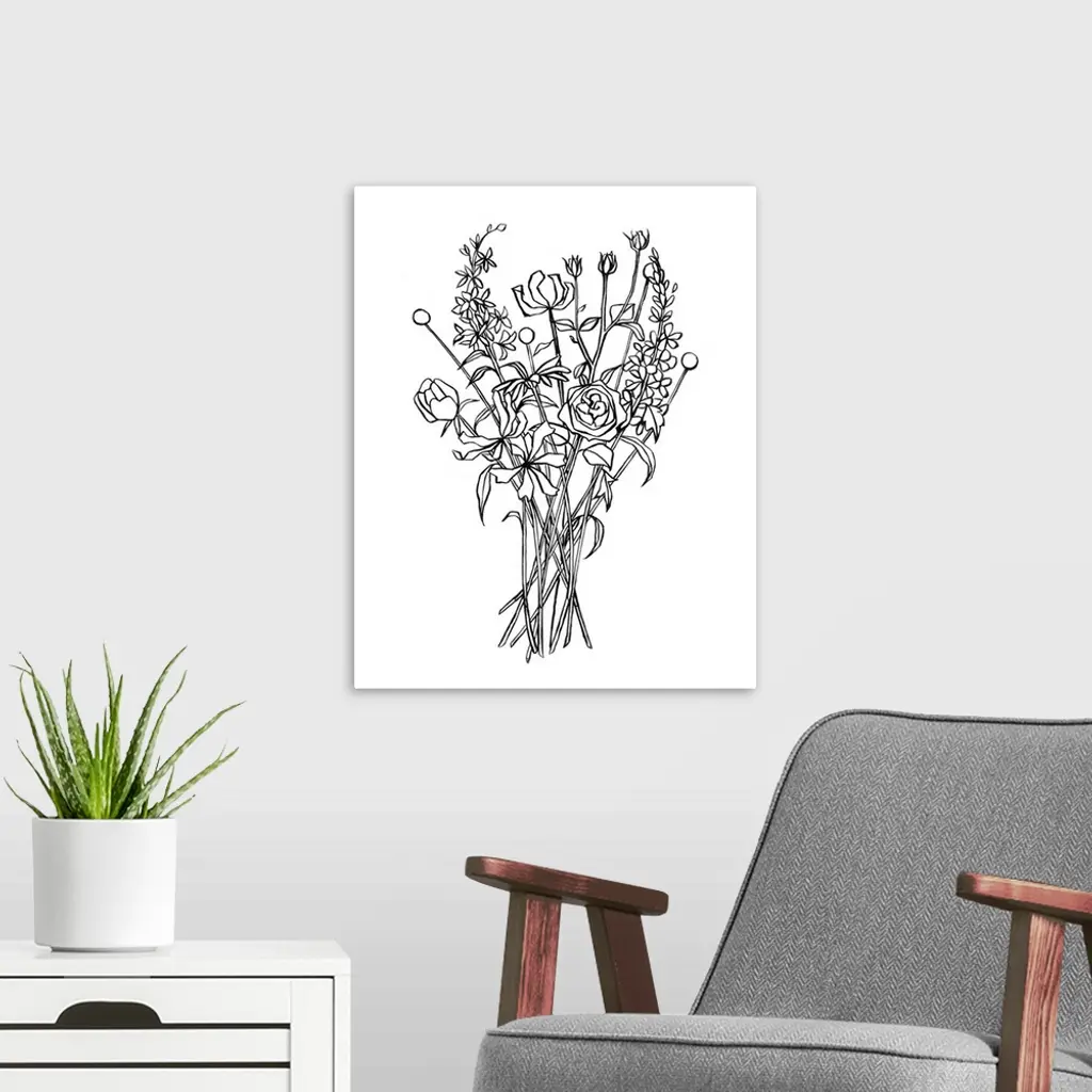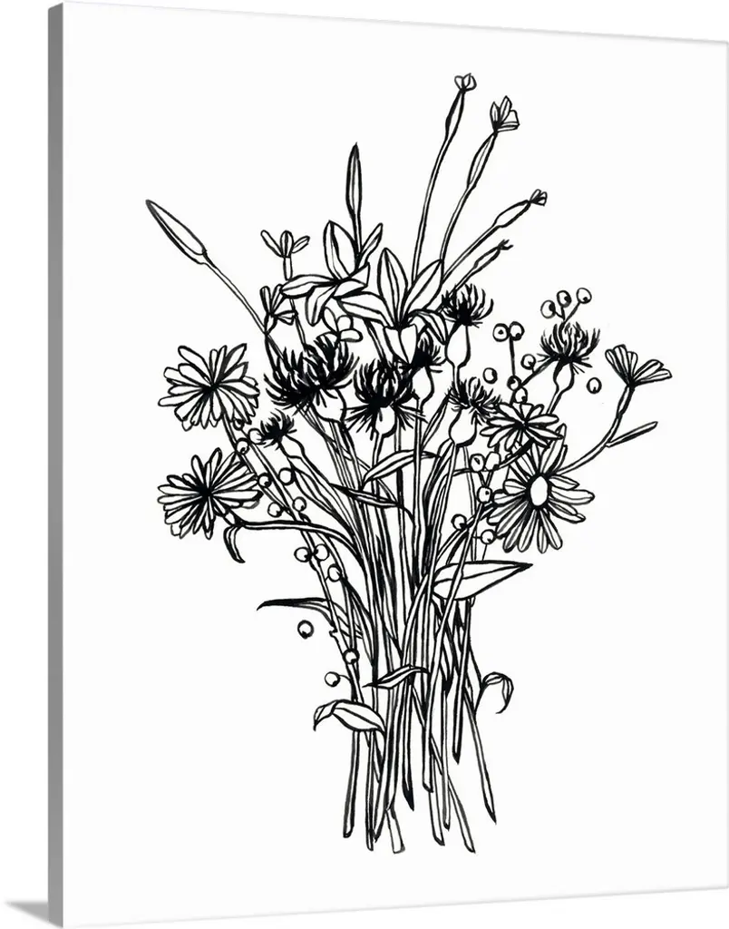 Contemporary painting of a floral bouquet outlined in black on a white background.