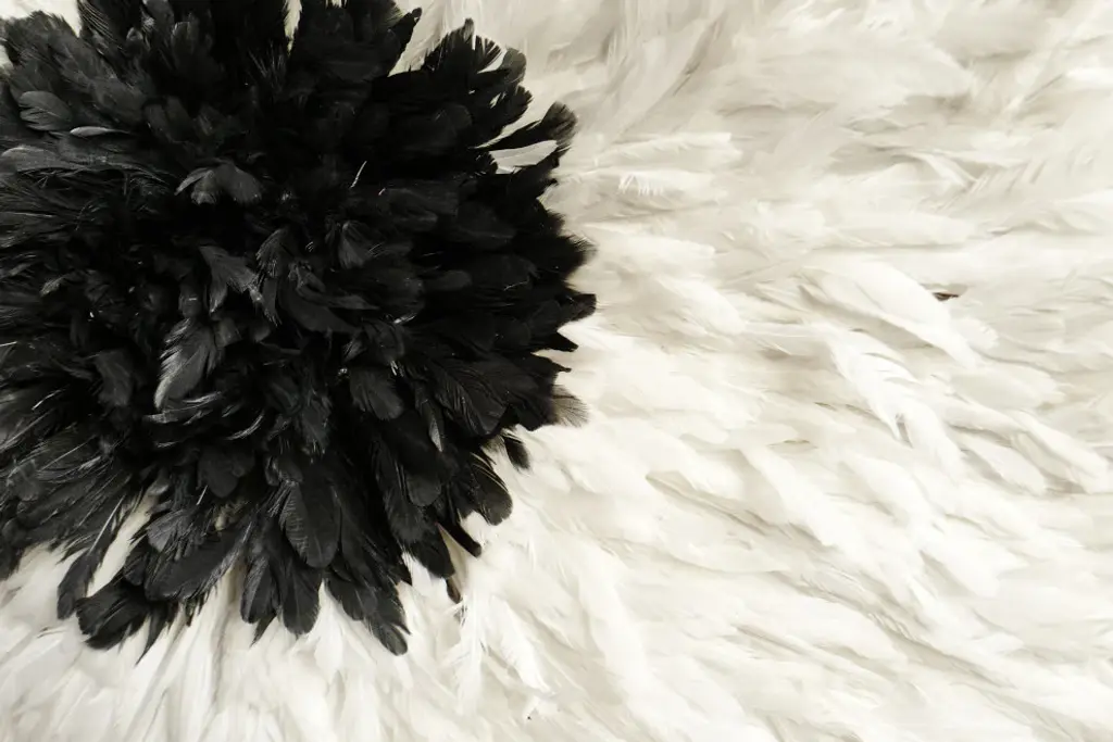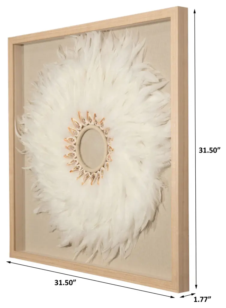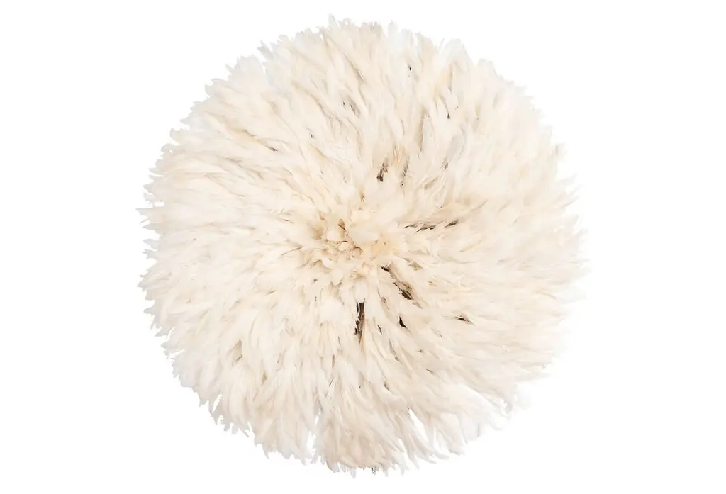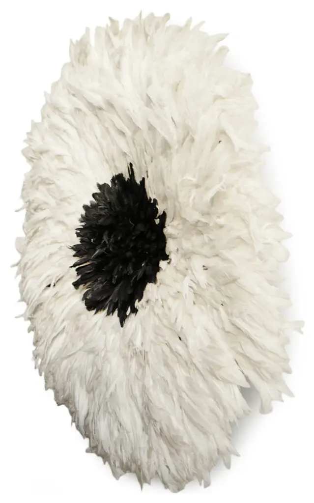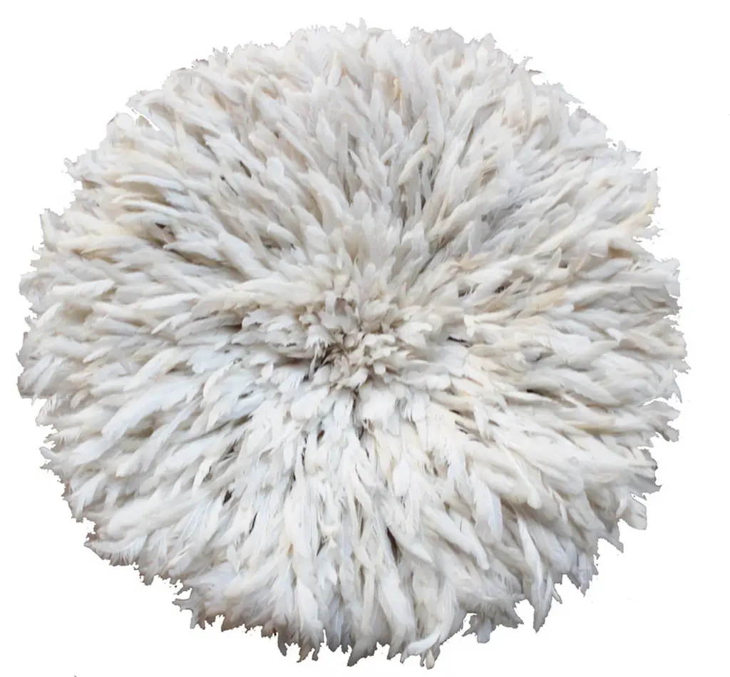 Beautiful hand crafted original JuJu hat wall art. These attractive natural bird feather art form were originally worn as a headdress by dignitaries, chiefs, and the royal families also wear these ceremonial hats as a symbol of prosperity and wealth. Created from woven natural or brightly colored dyed wild chicken feathers then tied to straps and pulled open into a stunning circular display. Each is unique. Sizes vary approx. 29" - 32" diameter.