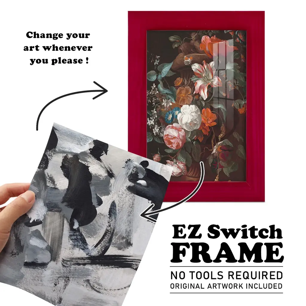 Black & White Mix IV -EZ SWITCH Framed Print w/glass-Cherry Red A delightful, framed print. Featuring a solid wood frame with real wood glass. This premium print is giclee quality. In addition, every frame features a removable back and table top stand. This allows you to change your art in the future or to just stand the art on a table for a new look. We are sure you'll enjoy our new series of EZ SWITCH Framed Art. Solid Wood Frame Real Glass Removable / Replaceable Art Built in Tabletop Stand Sizes range from 4x6 up to 12x15 - buy just one or pair them up as sets as you see fit.