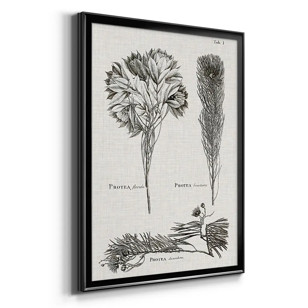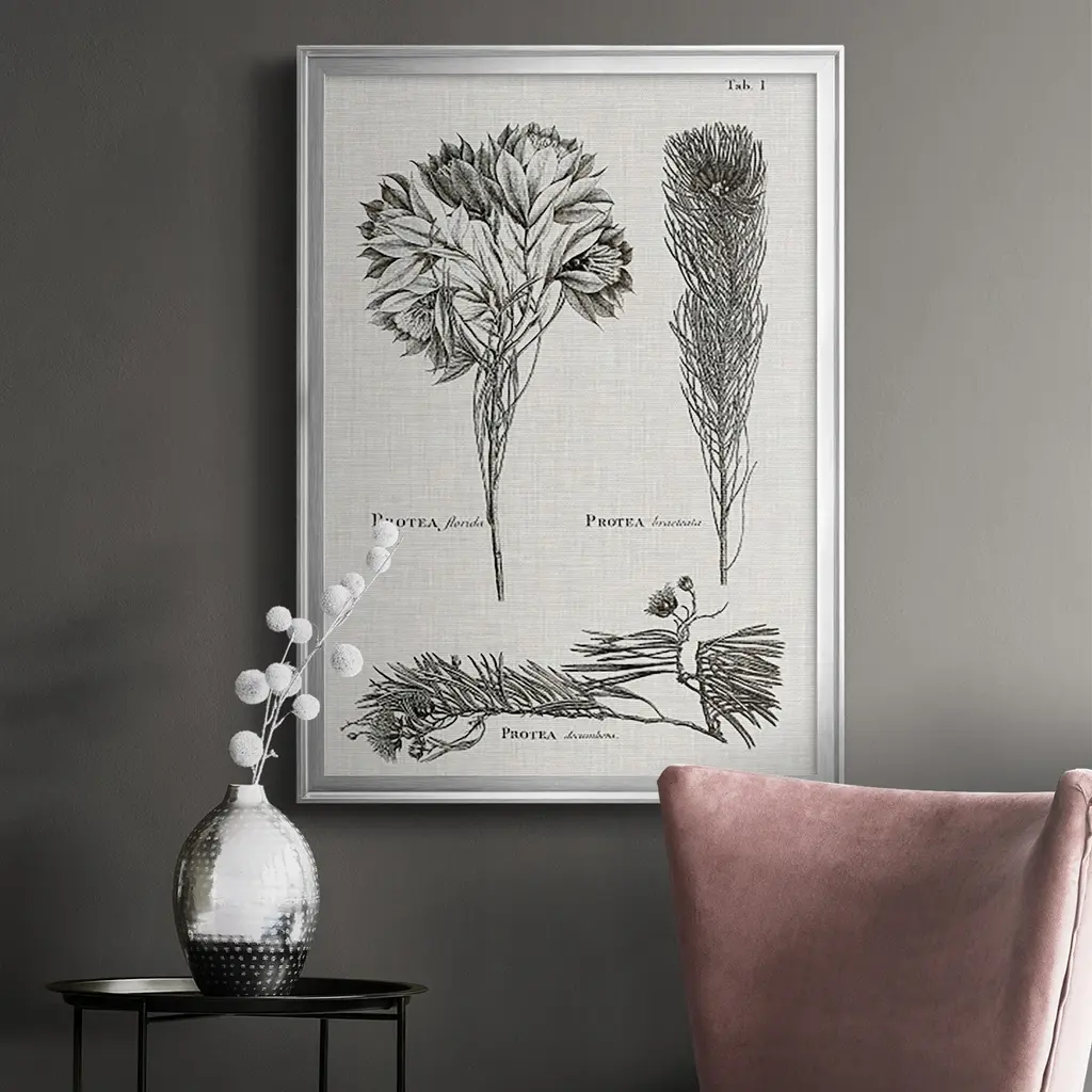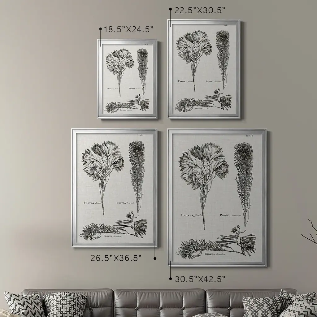 Black & White Protea on Linen I Premium Framed Print - Ready to Hang A Premium Framed Print created to last. Framed in distressed wood and available in an array of sizes and colors Featuring a beveled a solid wood stretcher bar, each piece comes ready to hand 4 SIZES AVAILABLE 30.5''X42.5'' - Overall Size 26.5'X36.5'' - Overall Size 22.5''x30.5'' - Overall Size 18.5''x24.5'' - Overall Size Each piece is made to order. Each piece comes with hanging hardware. Made in the USA Ready to Hang