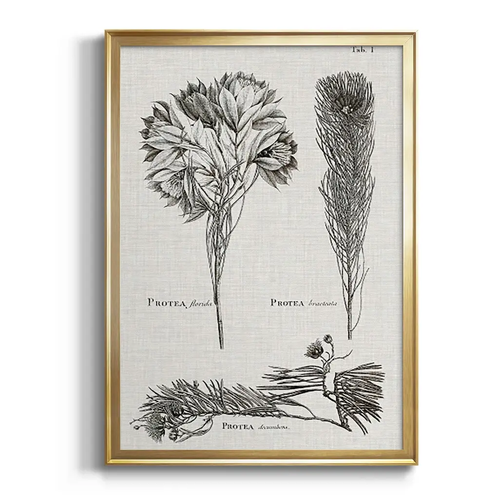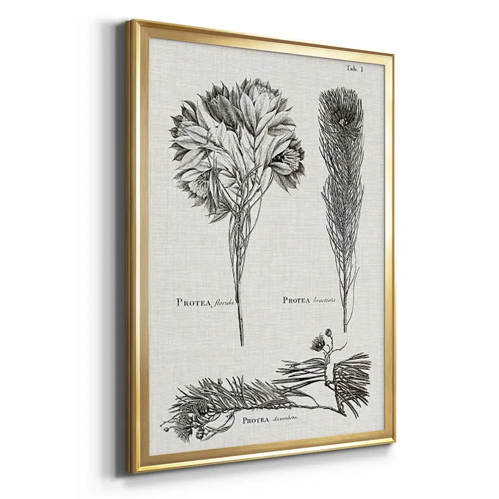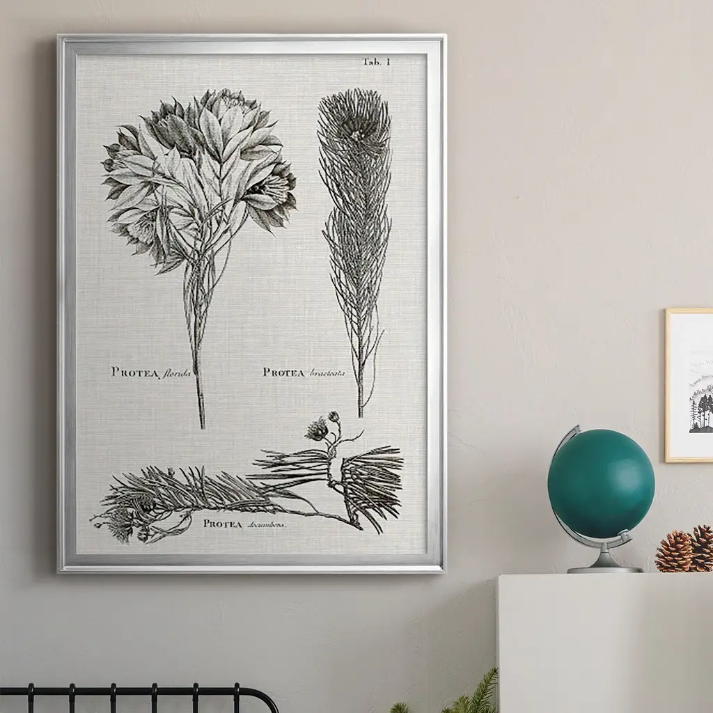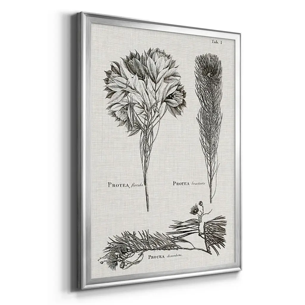 Black & White Protea on Linen I Premium Framed Print - Ready to Hang A Premium Framed Print created to last. Framed in distressed wood and available in an array of sizes and colors Featuring a beveled a solid wood stretcher bar, each piece comes ready to hand 4 SIZES AVAILABLE 30.5''X42.5'' - Overall Size 26.5'X36.5'' - Overall Size 22.5''x30.5'' - Overall Size 18.5''x24.5'' - Overall Size Each piece is made to order. Each piece comes with hanging hardware. Made in the USA Ready to Hang