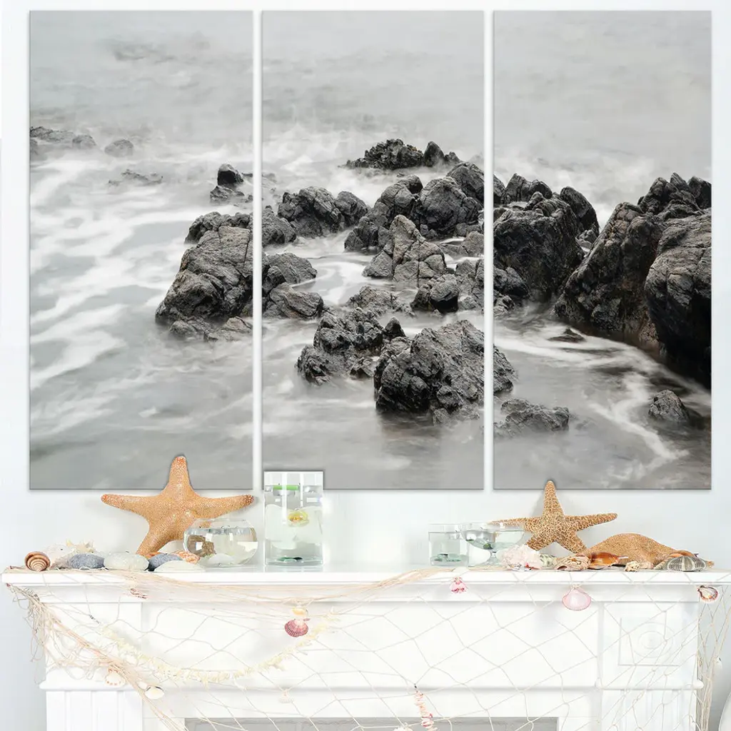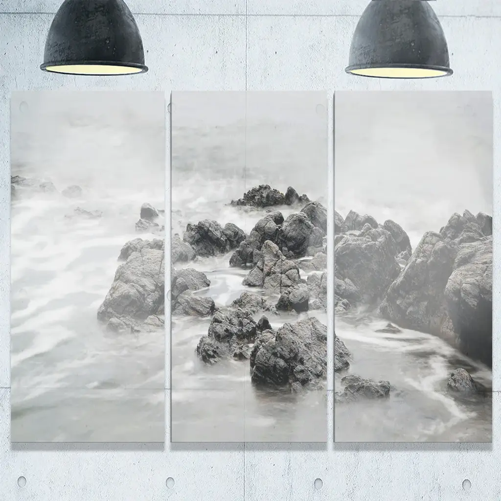 "Black And White Rocky Coastline" Metal Wall Art, 3 Panels, 36"x28"