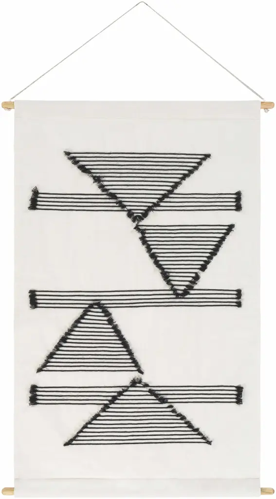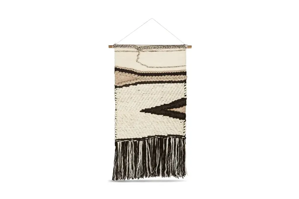 This black and white wall art from Tanzania is handcrafted with intricate geometric patterns and cascading fringe, offering depth, texture, and movement. Designed in a long rectangular hanging shape, it works beautifully as black and white modern wall art for tall walls or narrow spaces. Whether styled as art for entryway, hallway, or office, this large white wall art brings a refined look. Its elegant blend of tradition and minimalism fits effortlessly into coastal, bohemian, farmhouse, and modern interiors., A black and white modern wall art piece for entryways, stairwells, and hallways., Use this white decorative wall art to elevate narrow walls. , A white decorative wall art alternative to framed pieces, perfect for high-traffic areas and family-friendly spaces.