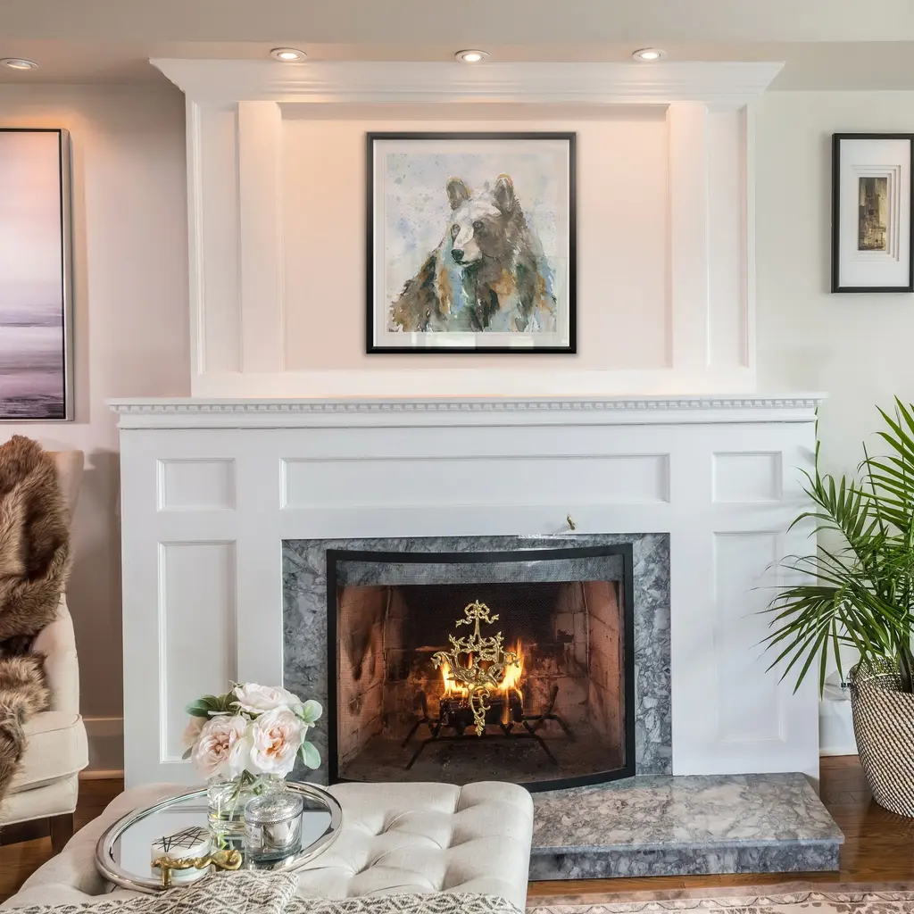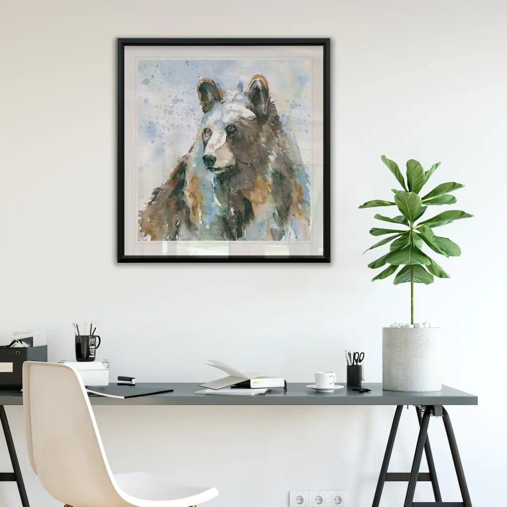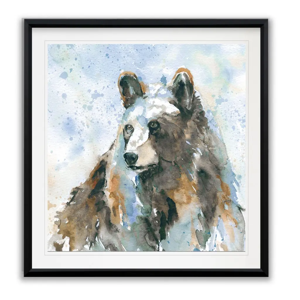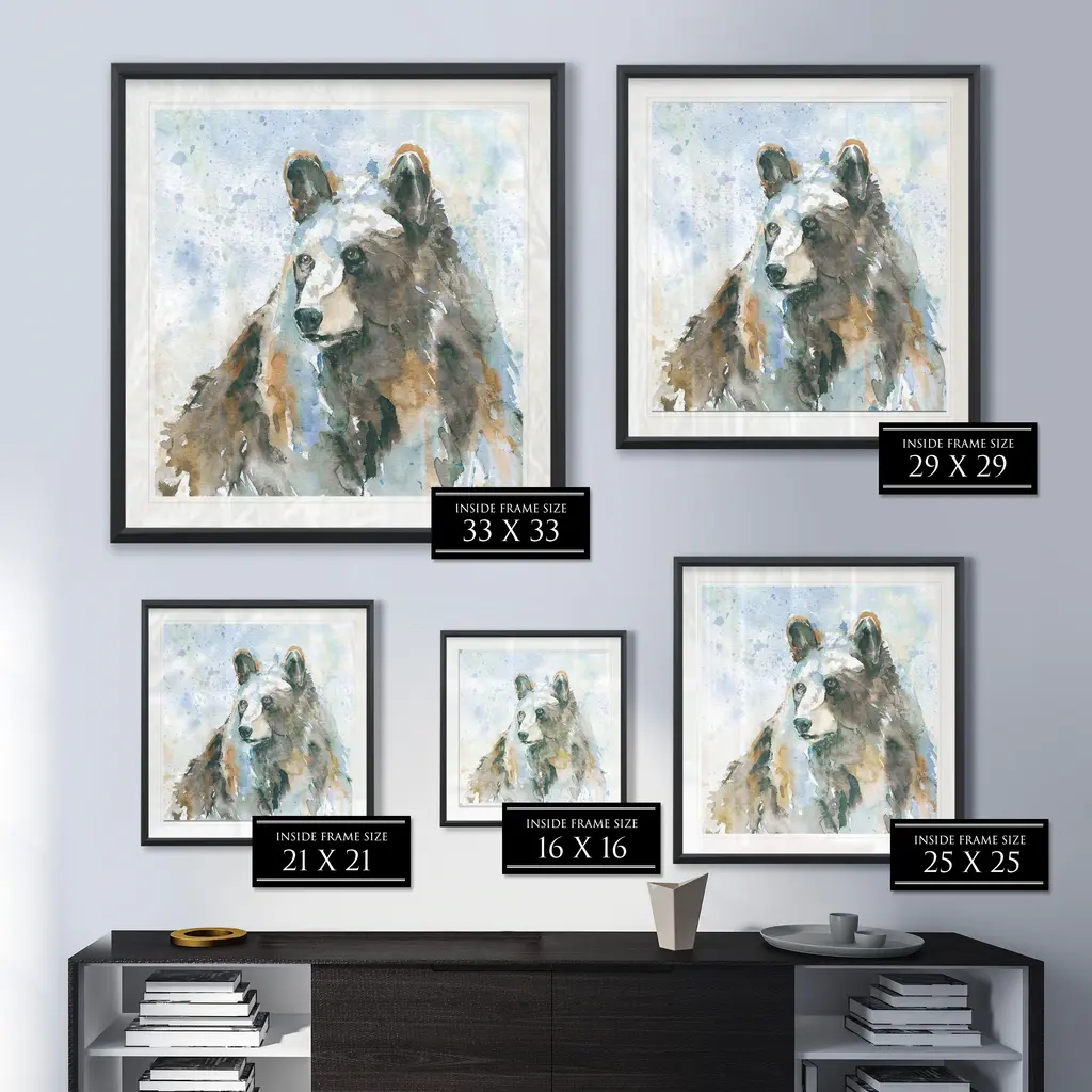 Black Bear On Blue -Framed Giclee Print A premium framed giclee print Printed using the last archival inks. Each print is carefully printed and framed by hand. Each piece features a 2'' Beveled matt board, acrylic glass and comes ready to hand. 5 SIZES AVILABLE 16''x16''- Overall Size 24''x22''- Overall Size 28''x28''' - Overall Size 32''x32''' - Overall Size 38''x38'' - Overall Size ** Overall size may vary slightly from piece to piece Each piece is made to order. Built to Last Each piece comes ready to hang Archival Ink 2'' Matt Board Assembled by hand in the America