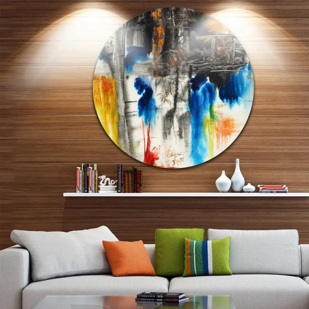 Bring Contemporary Abstraction to your home with this large Circle Metal wall art. This Black, Blue and Yellow Pattern Metal Artwork makes it the focal point of any room or office. - White Gloss Coating ensures colors are extra vibrant with light reflection.- Aluminum grade Sheet Metal with 1 inch mounting frame on the back giving the illusion that the artwork is floating on the wall..- Mounting Brackets are included along with instructions.- High Quality Digital images are created directly into a glossy aluminum panel producing a stunning and captivating print into the glossy finish of the metal.- Water, Fire and Scratch resistant HD Aluminum panels.- Looks better than any photo paper and guaranteed to last at least 20 years- Easy to clean with a microfiber cloth. Colors are far superior to regular Canvas Art. - Easy to Hang