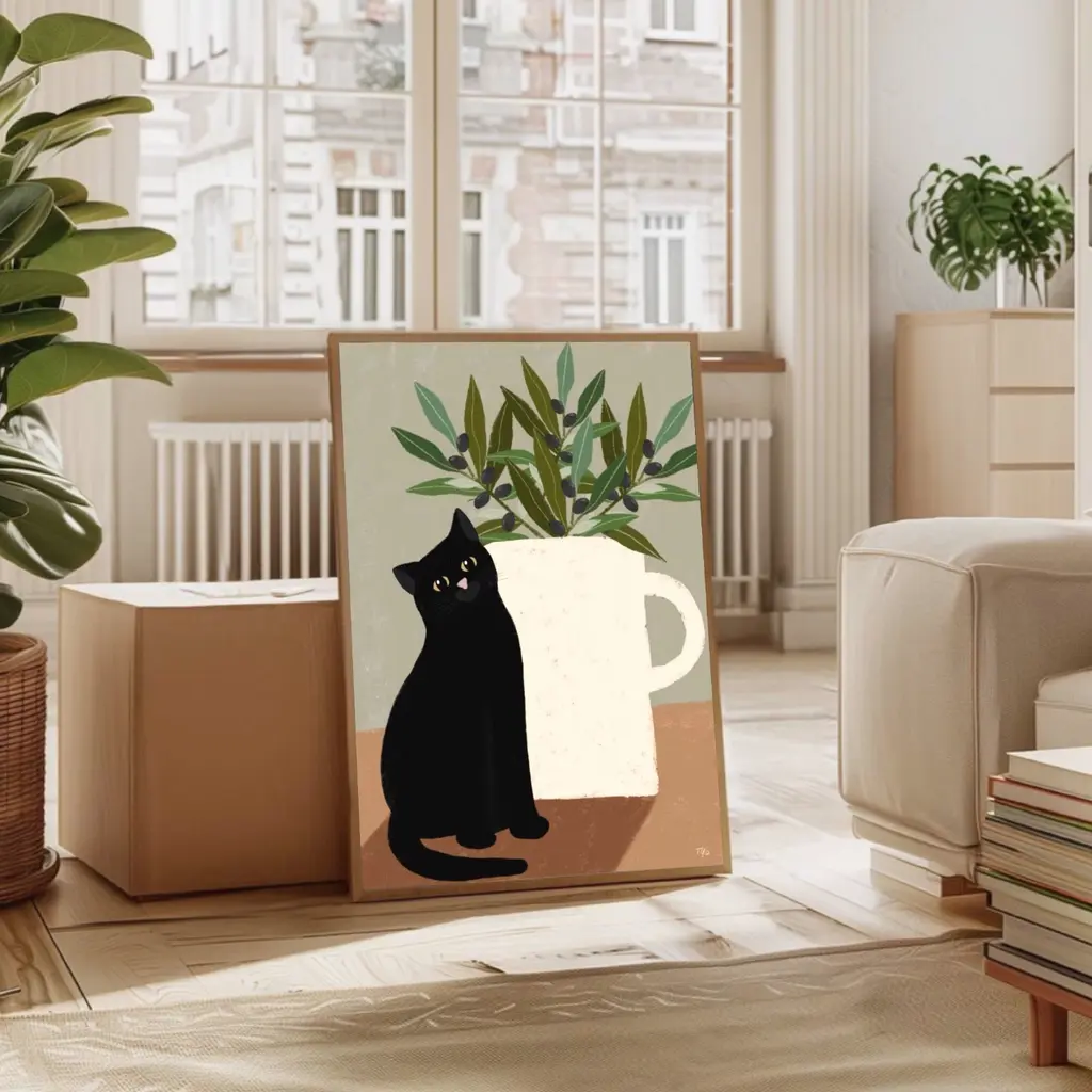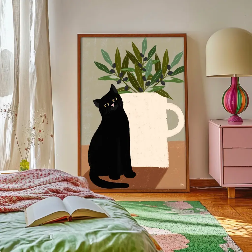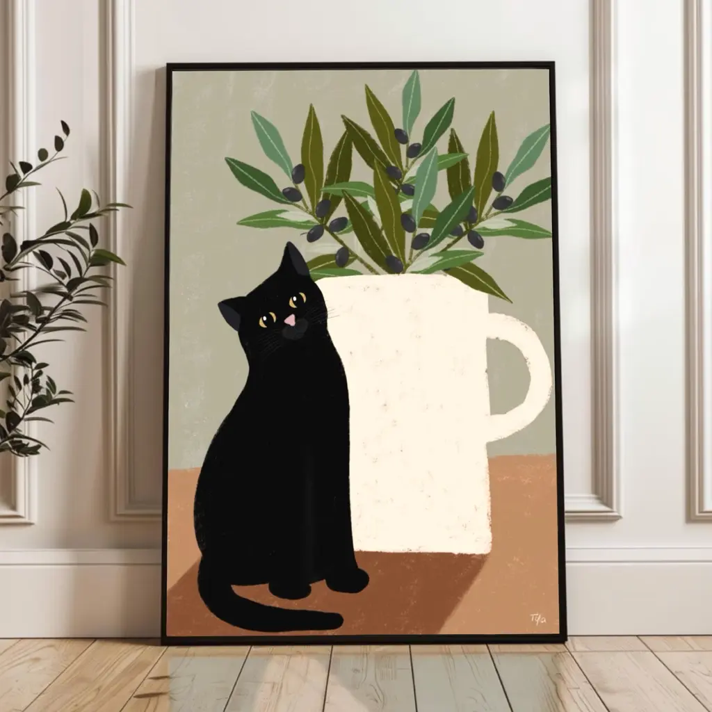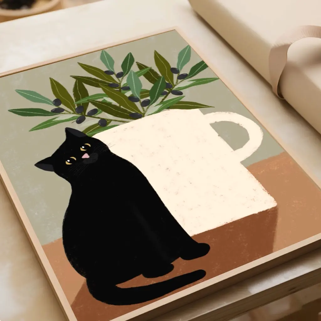 Black Cat And Olives - Art Print - MediumIllustrated by Maria. This print is perfect for all cat lovers alike! Printed in the U.K.Printed on premium matte, fine art, archival paperPaper weight: 230 gsmSold without a frame.
