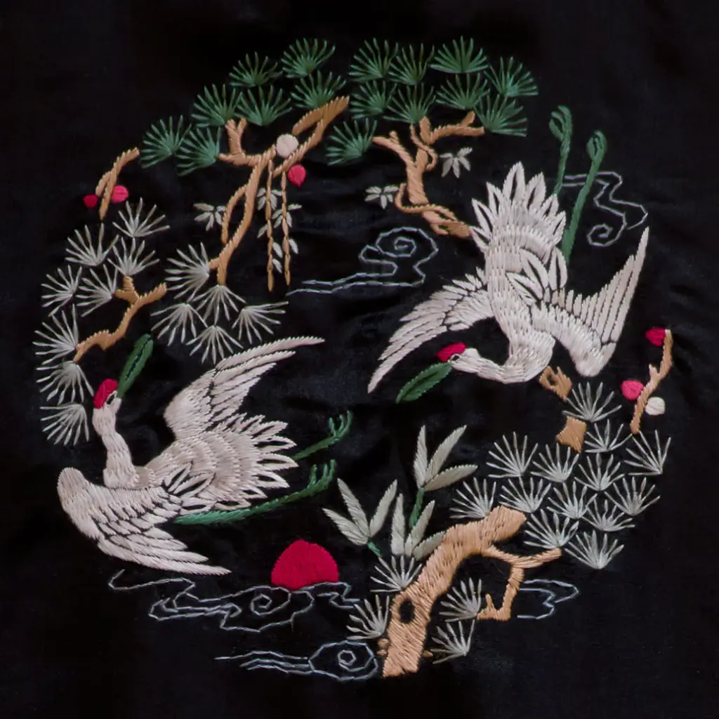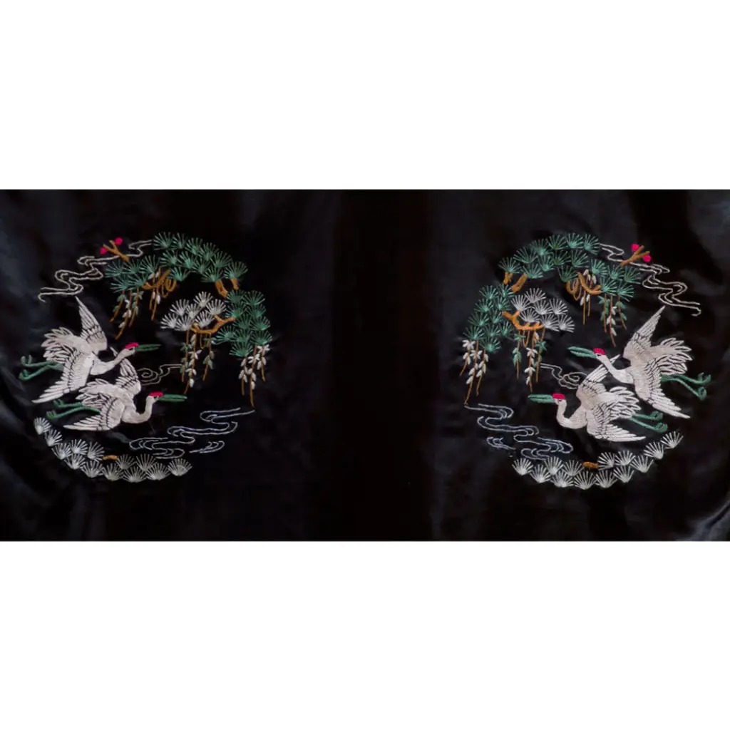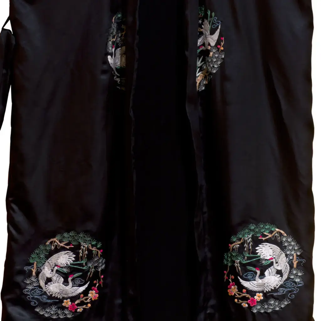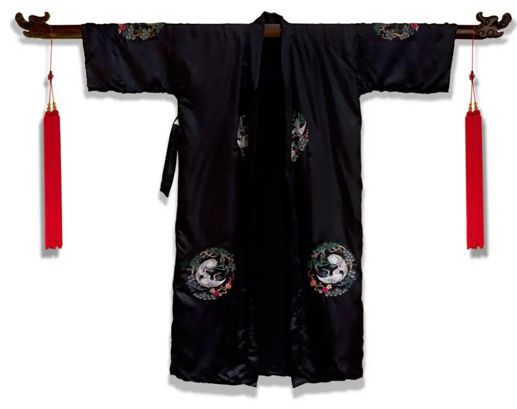Traditionally only worn by royalty, the silk robe was a symbol of power and wealth. Today, the silk robe has now become a prized collector''s piece. This beautiful black silk robe features intricate embroideries of longevity crane designs on its front and back.In Chinese myths and legends, the red-crowned crane is a creature of immortality. Individuals who have acquired immortality are often said to be carried off by a crane. The red-crowned crane is also associated with uprightness and nobility in Chinese Imperial Courts. Ceremonial bronze wares from the Shang and Zhou Dynasty are often adorned with crane imageries. During the Ming and Qing Dynasty, uniforms of high-ranked civil servants are embroidered with red-crowned cranes, ranking the crane as an important animal alongside the tiger, and following only the mythical dragon and phoenix.This piece now serves as a unique work of art that will create a stunning focal point in any room. Wooden hanger and tassels are sold separately.This item will be shipped from Westmont, IL 60559 U.S.A• Use: Wall Decoration, Wall Art, Silk Robe• Material: Silk• Color: Black• Make: Hand-crafted• Origin: China• Dimensions: 54"W x 1"D x 52"H� 100% Silk� Embroidered by hand� Dry clean only� Tassels and hanging rod are sold separately • Attributes: Asian, Oriental, Chinese