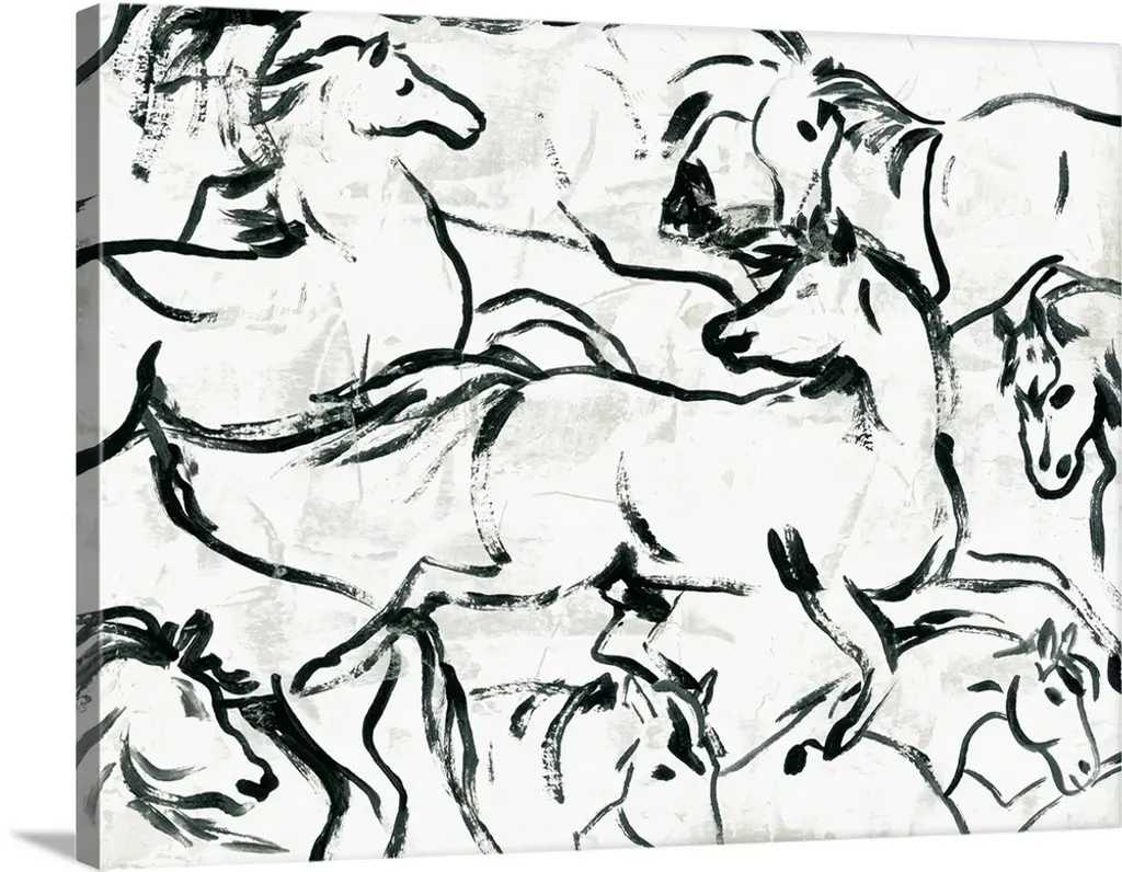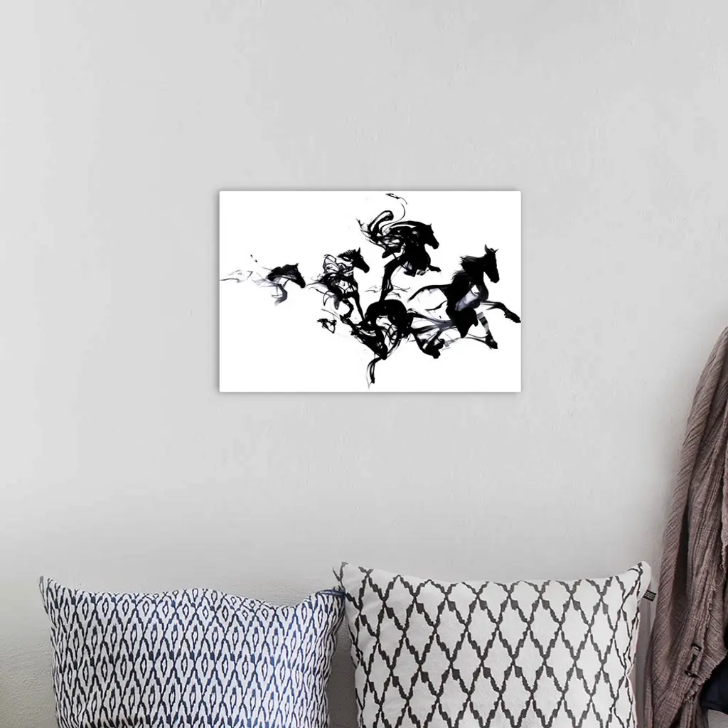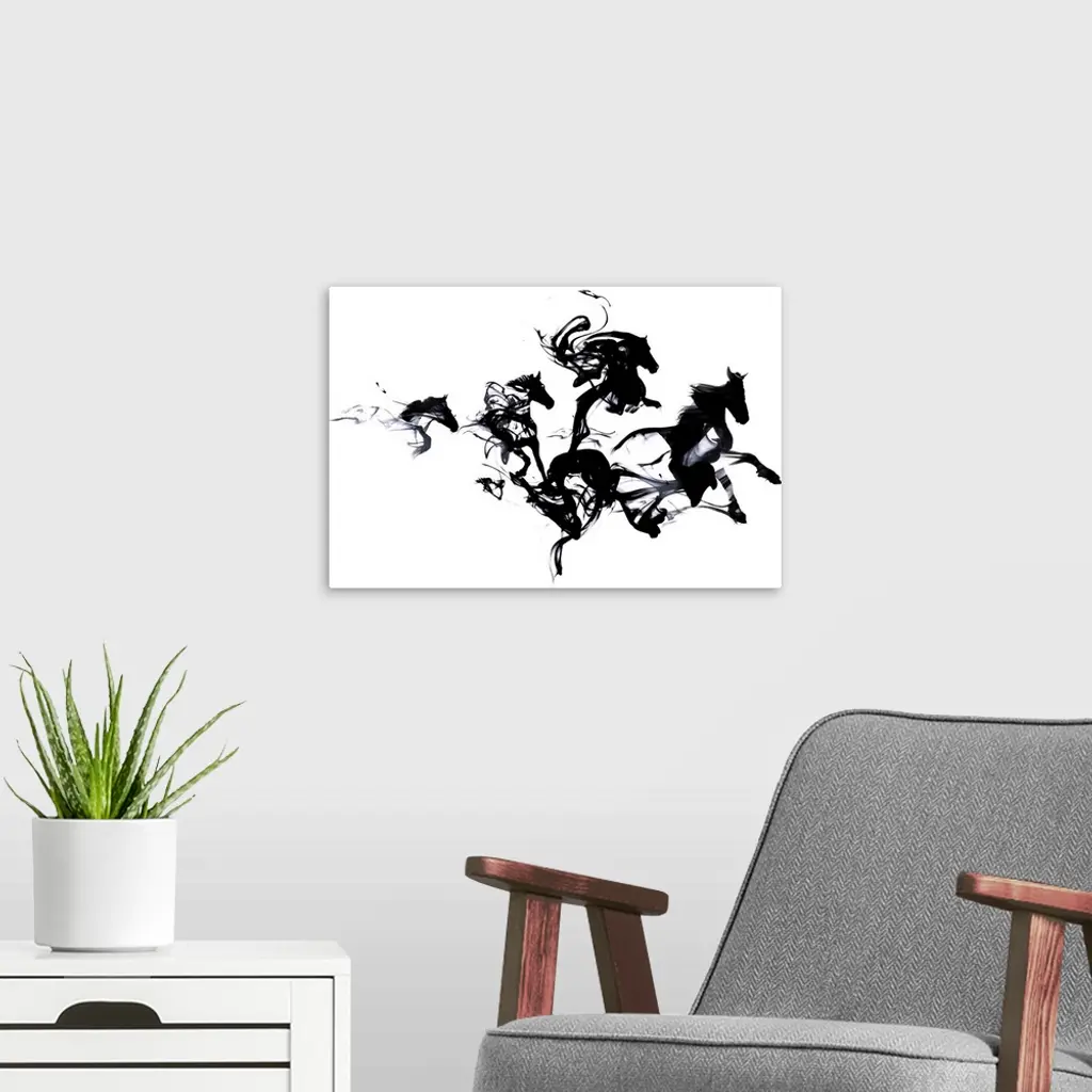 Contemporary artwork of black ink blotches creating the shape of galloping horses.