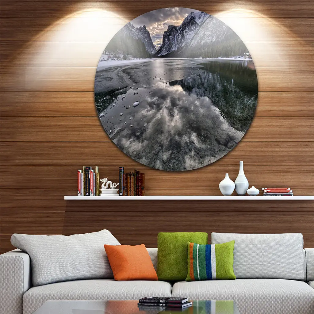 Black Icy Mountain Lake With Snow, Landscape Disc Metal Wall Art, 23"