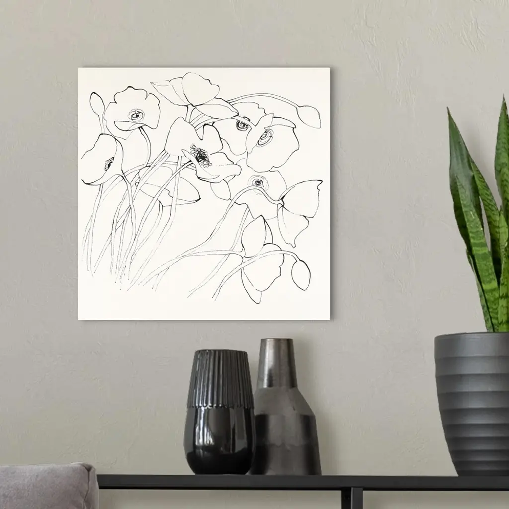 Contemporary illustrative artwork of outlined flowers against a cream toned background.