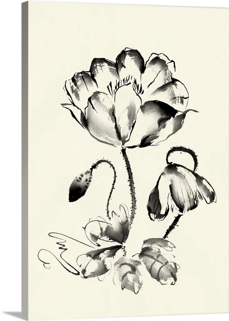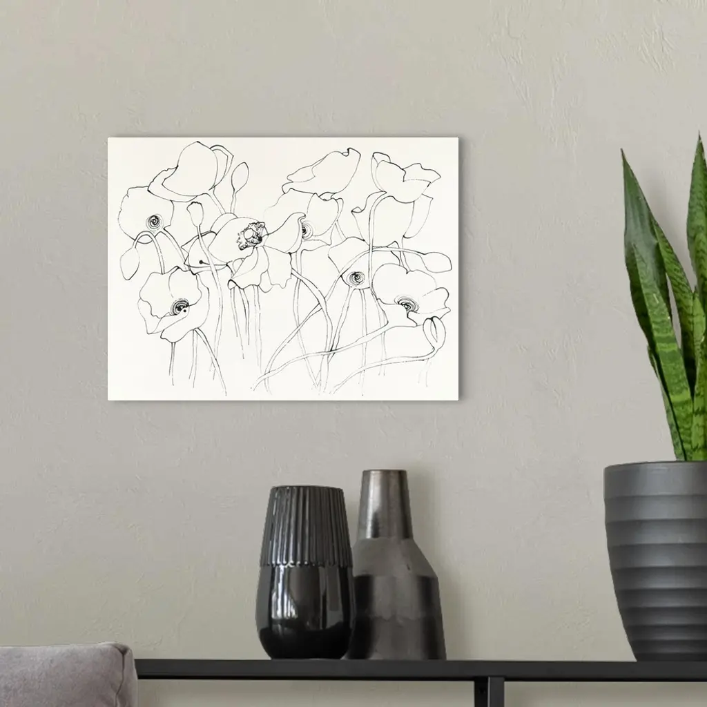 Contemporary illustrative artwork of outlined flowers against a cream toned background.