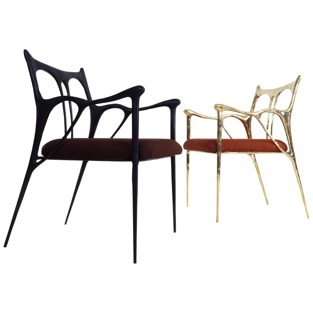 Black Painted Brass Sculpted Chair with Seat Upholstered by MisayaDimensions: W 54 x L 58 x H 79 cm (seating: 63)Hand-sculpted chair in brass.The translation of Art Nouveau’s whiplash motifs through the subtle expression of an oriental brushstroke. The sculpturally slim brass casting places this fit for an art piece. A statement to Revive the philosophy of L’œuvre d’art totale, the total work of art in our daily life.