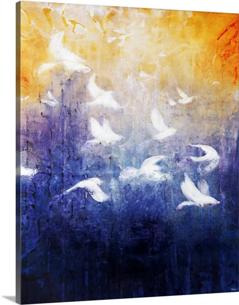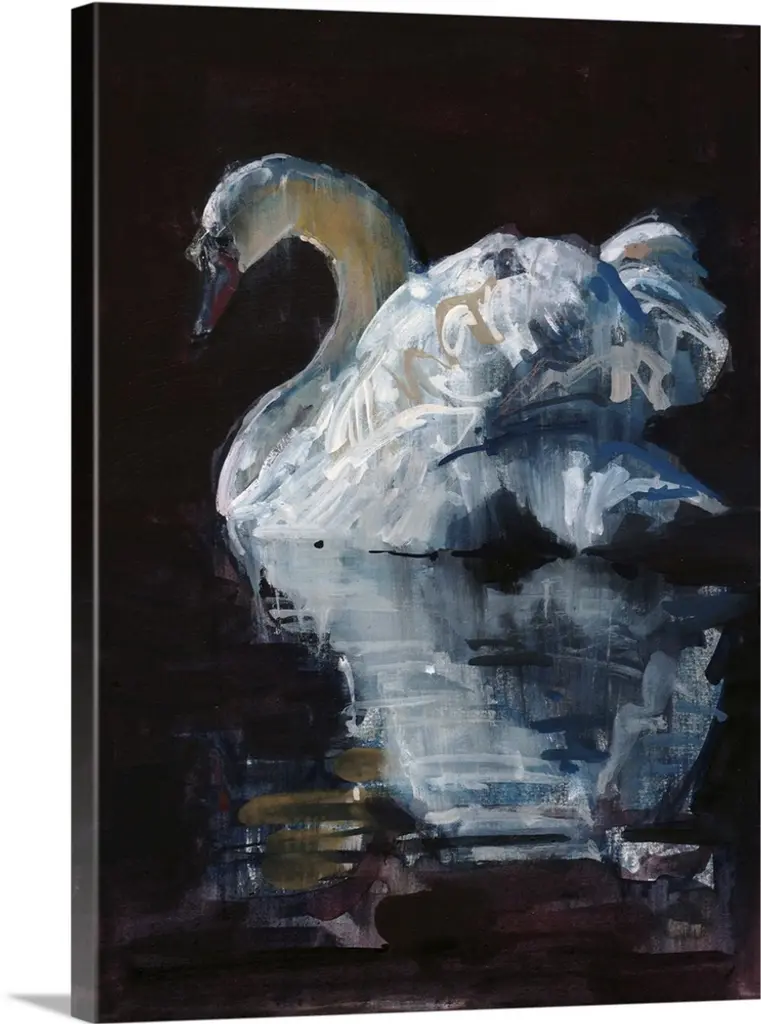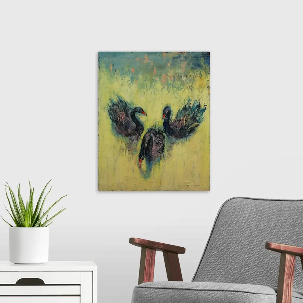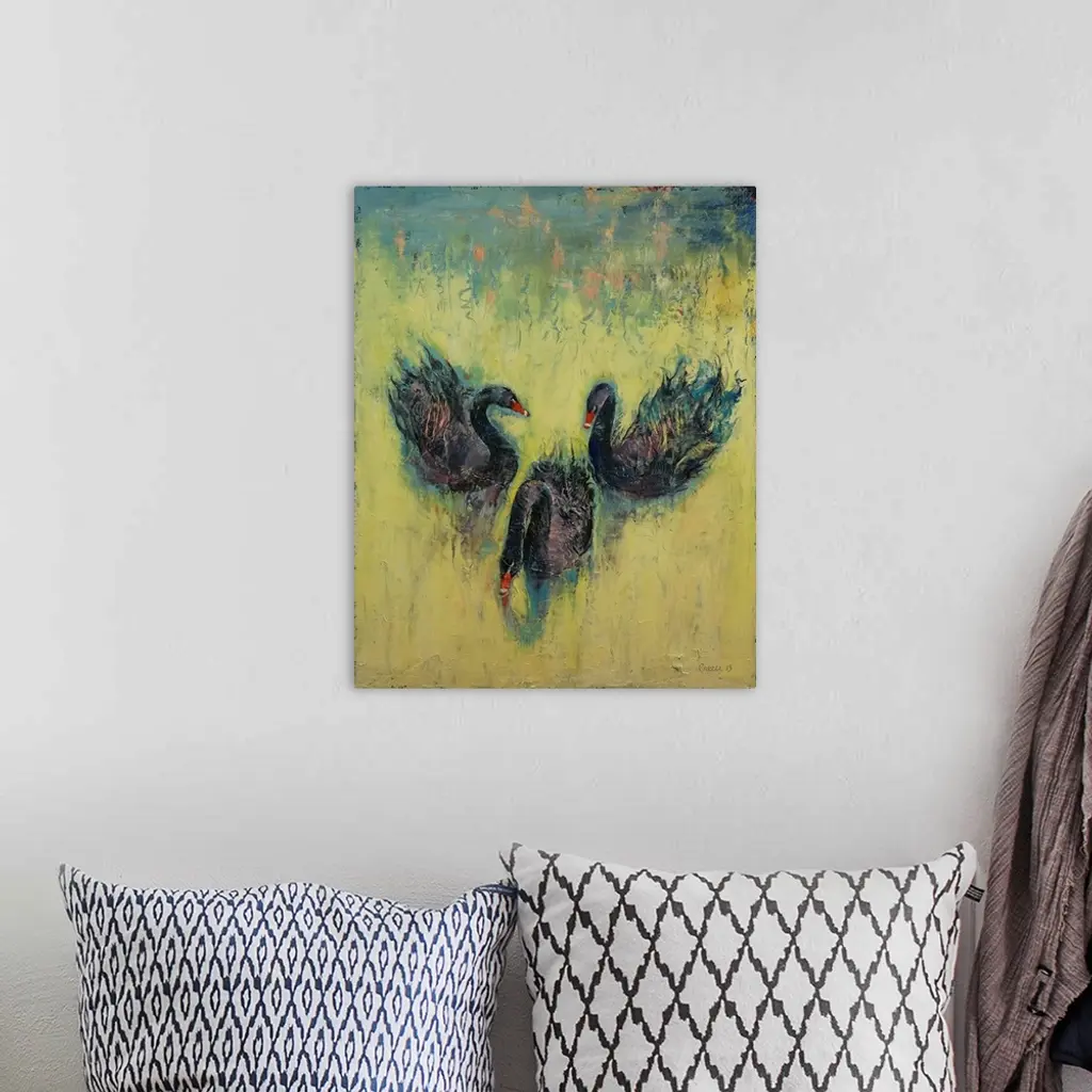 A contemporary painting of three black swans making the eyes and nose of a human skull.