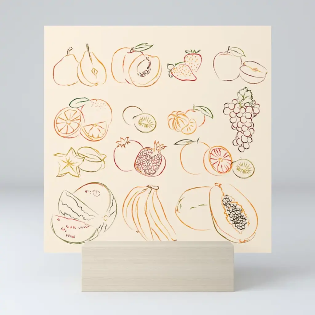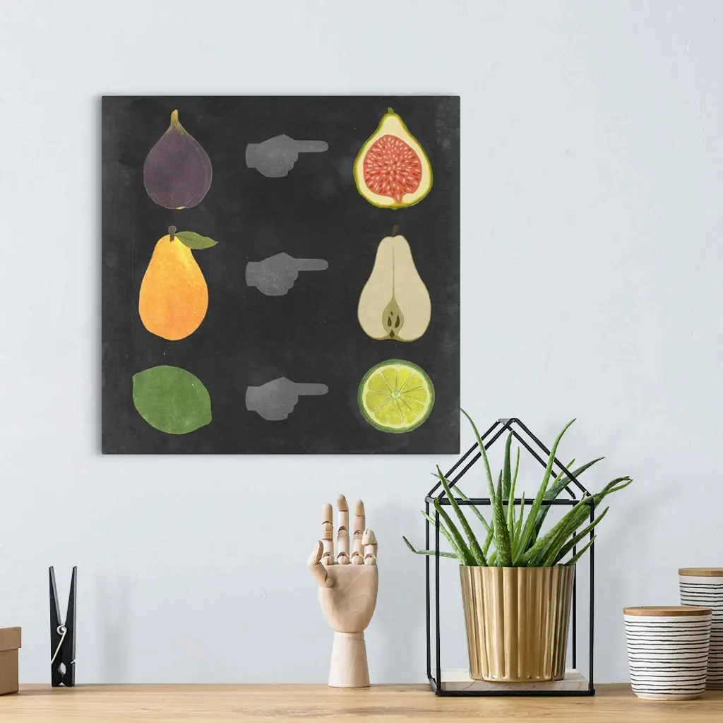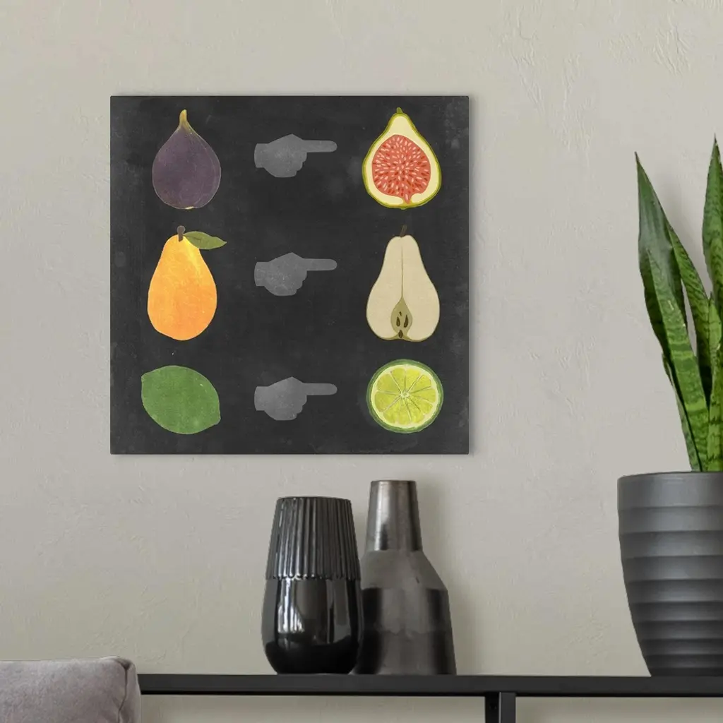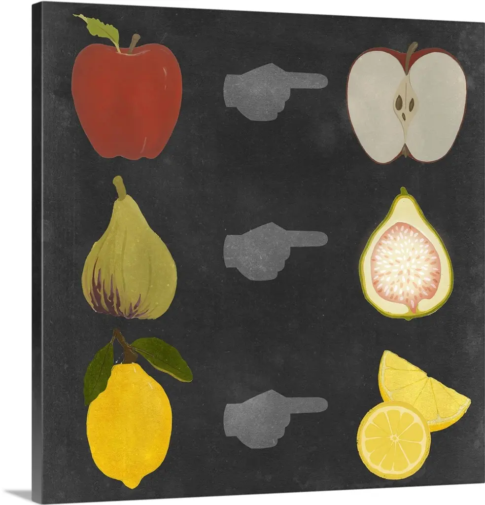 Contemporary artwork of fruits and their halves in chalkboard style.